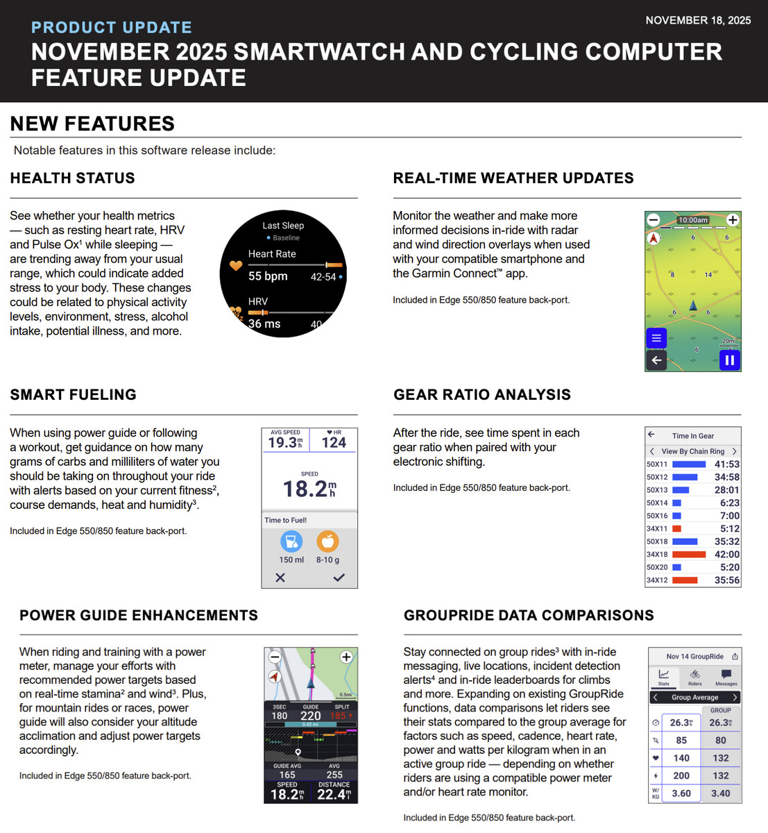 Garmin утверждает, что обновление November 2025 Feature Update будет выпускаться постепенно. Таким образом, может пройти еще несколько недель, прежде чем соответствующие обновления программного обеспечения появятся на соответствующих велокомпьютерах и смарт-часах. К сожалению, компания Garmin пока не подтвердила номера сборок соответствующих обновлений программного обеспечения.