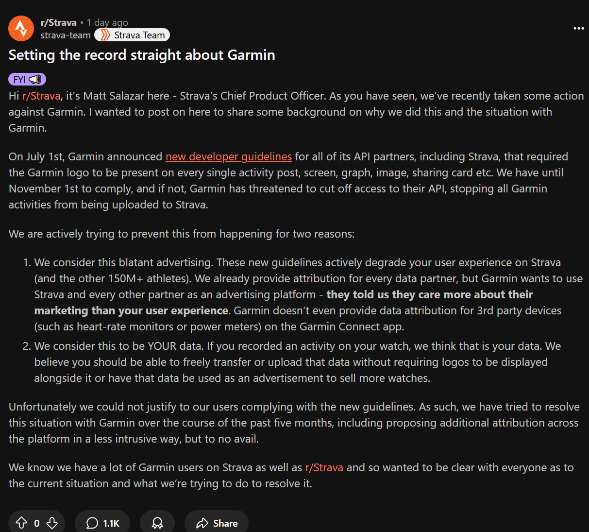 Между тем, Strava считает, что Garmin злоупотребляет патентами 9297651 и 9778053, которые, по утверждению Strava, относятся к "созданию карт активности, предпочитаемых пользователем". На данном этапе неясно, какое влияние окажет, если вообще окажет, это судебное разбирательство на программные и аппаратные линии Garmin. При этом недавнее сообщение на Reddit, сделанное директором по продуктам Strava, указывает на то, что проблемы компании с Garmin не ограничиваются только патентами. Если в будущем скриншот будет удален, пожалуйста, смотрите пояснение DC Rainmaker ниже для получения более подробной информации.