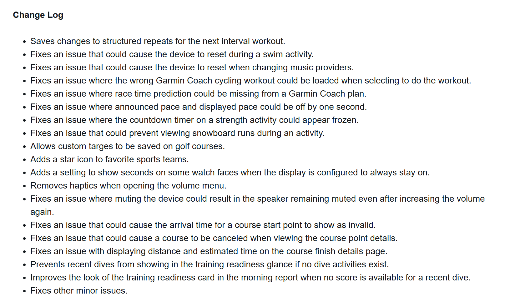 Бета-версия 16.14 посвящена улучшениям и исправлениям ошибок для этих новых смарт-часов Forerunner. В примечаниях к выпуску говорится, что Ваши любимые спортивные команды теперь отмечены значком звезды, а также добавлена новая настройка, позволяющая пользователям просматривать секунды на некоторых циферблатах с постоянно включенным дисплеем. Для дайверов улучшен внешний вид раздела "Готовность к тренировке" в Утреннем отчете, когда нет последних результатов погружения. Кроме того, игроки в гольф теперь могут сохранять пользовательские цели на полях для гольфа.