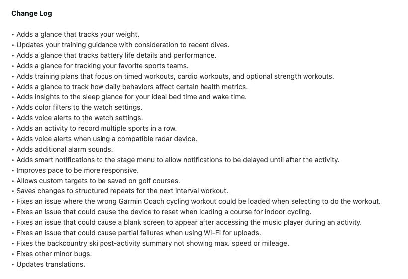 Пользователи Forerunner 570 и Forerunner 970 теперь могут сохранять пользовательские цели на полях для гольфа и сохранять изменения для структурированных повторов, чтобы подготовиться к следующей интервальной тренировке. Компания Garmin устранила проблему, когда загружалась неправильная велотренировка Garmin Coach. Кроме того, в смарт-часах появились обновления для функции перевода.
