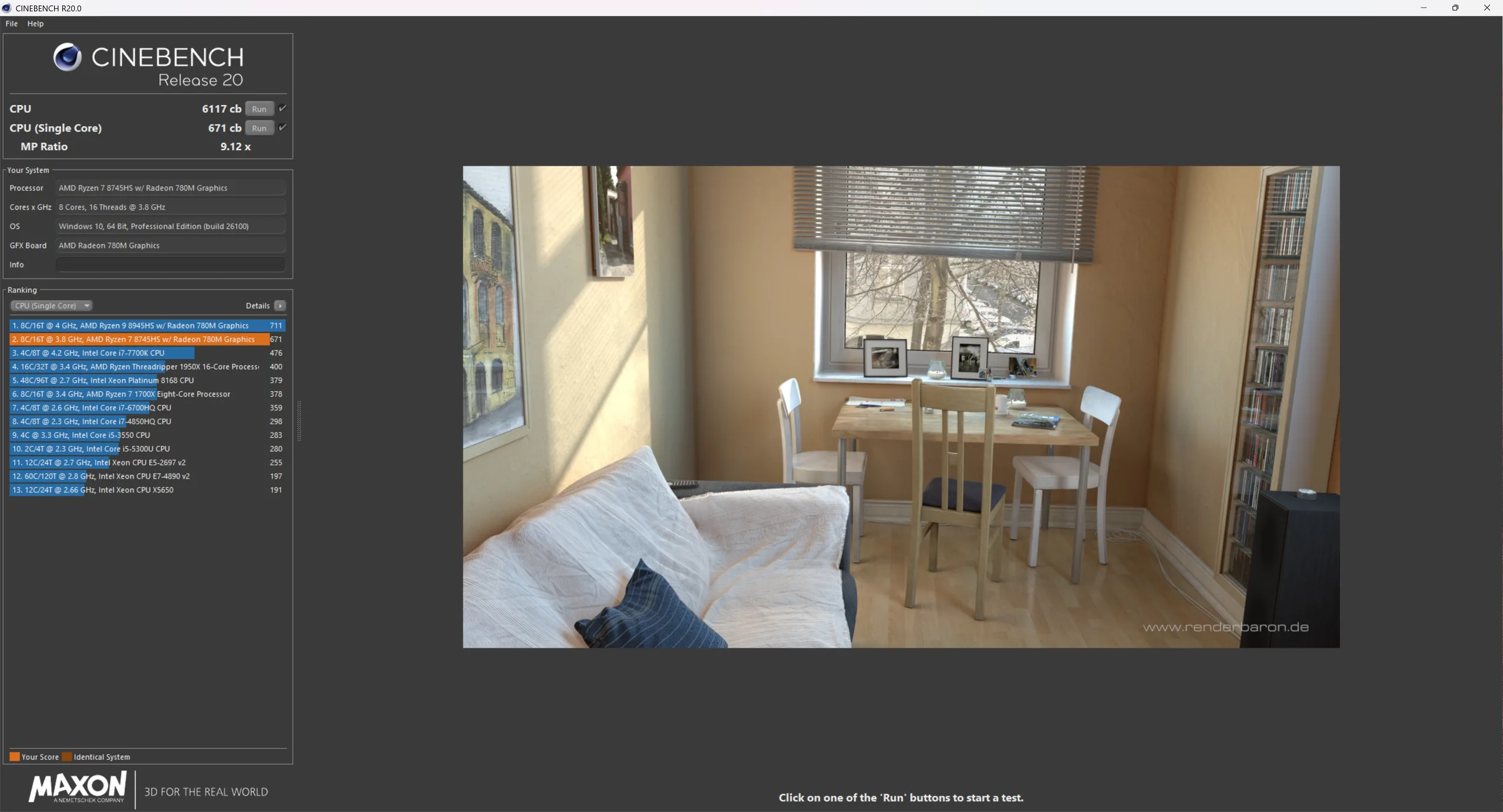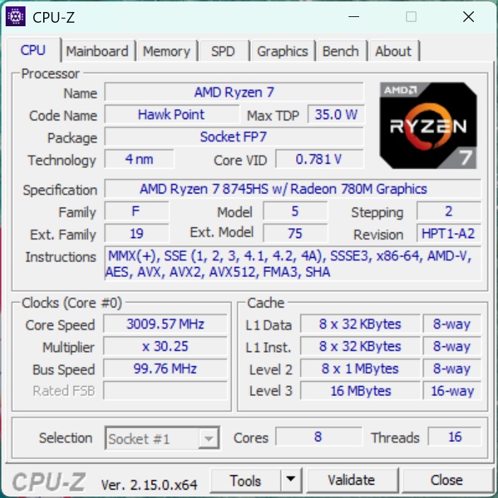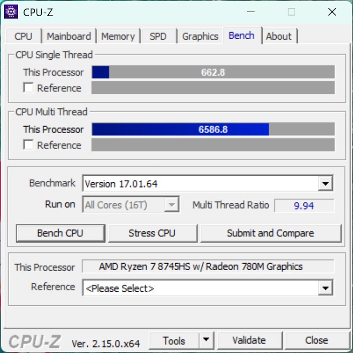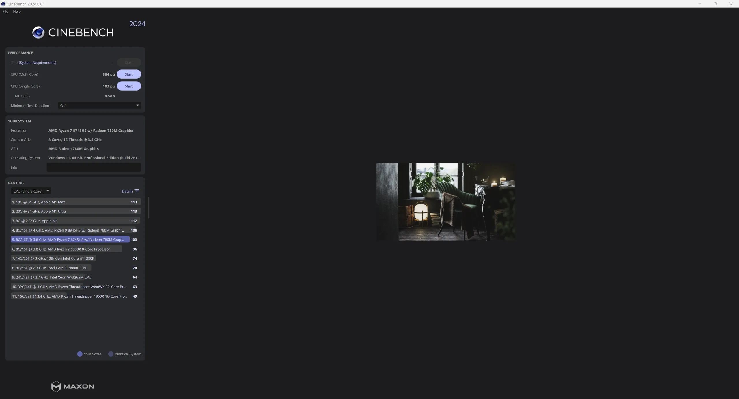 Geekom A8 с процессором AMD Ryzen 7 8745HS (Zen 4, 8 ядер) может достигать кратковременного энергопотребления до 60 Вт, но при постоянной полной нагрузке снижается примерно до 35 Вт. Это особенно заметно в многоядерных бенчмарках, таких как тест на выносливость Cinebench R15, в то время как одноядерная производительность находится на хорошем уровне. По сравнению с Geekom A8 с AMD Ryzen 9 8945HS, низкопроизводительное устройство отстает лишь немного.