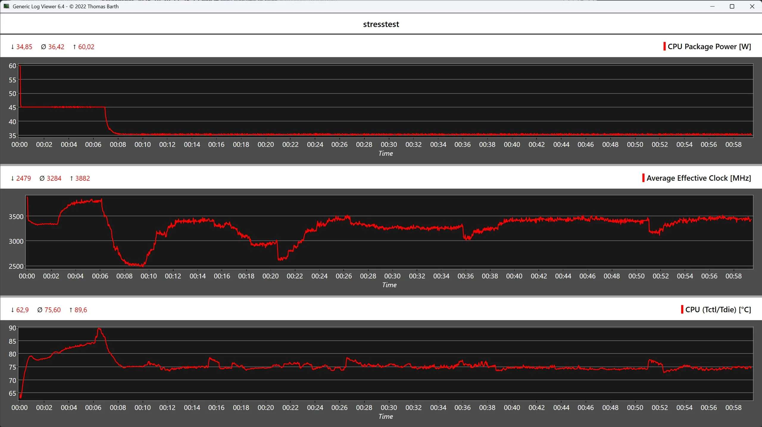Корпус Geekom A8 остается приятно прохладным как в режиме простоя, так и под нагрузкой, без каких-либо проблемных горячих точек. В стресс-тесте температура Ryzen 7 8745HS ненадолго поднимается примерно до 90 °C, но это безвредно. Система охлаждения надежно рассеивает постоянно присутствующий TDP в 35 Вт.