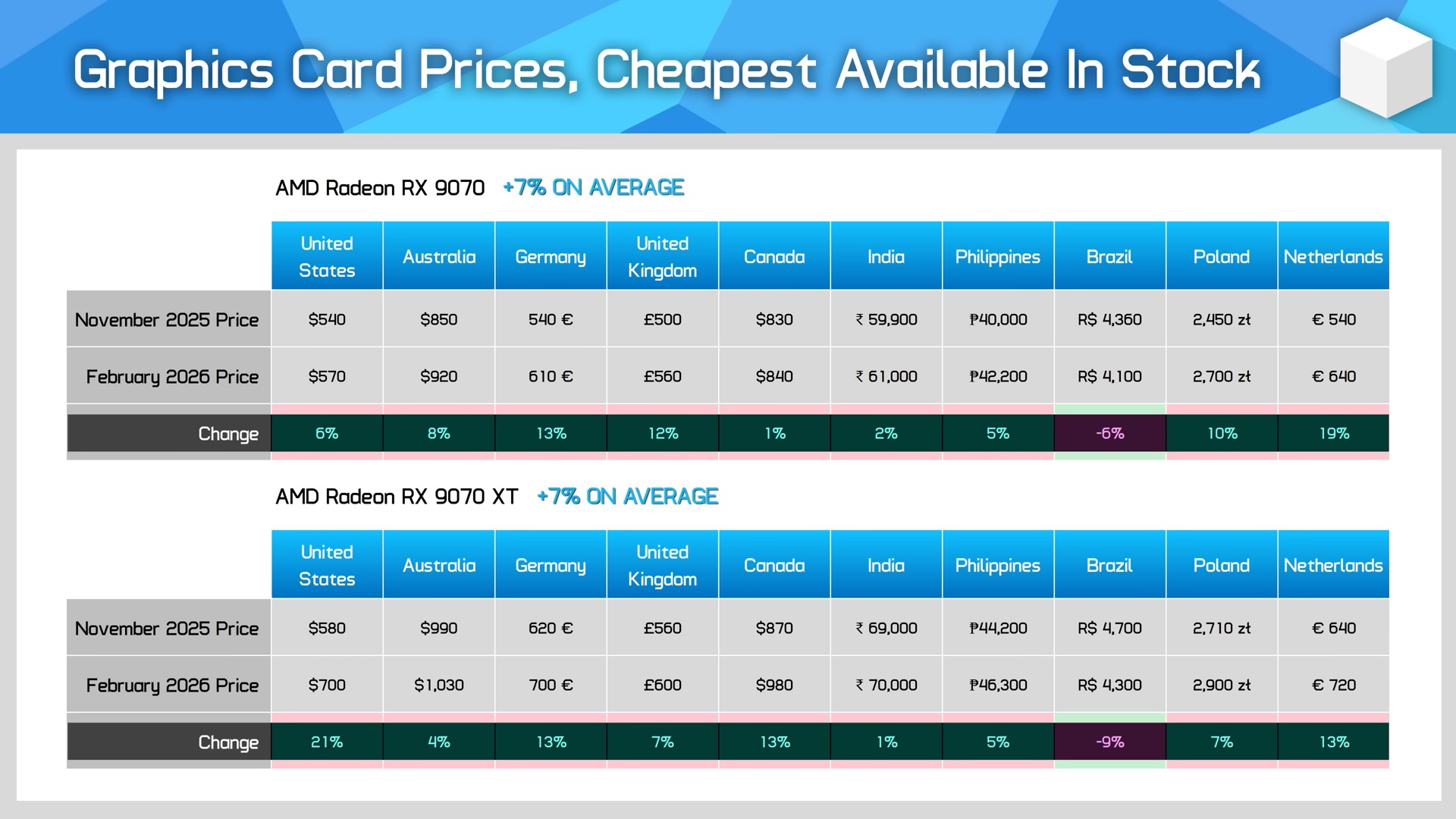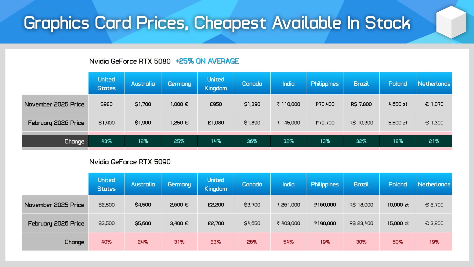 RTX 5070 Ti, поставки которой, как предполагается, сильно ограничены, в феврале 2026 года стоит в среднем на 25% дороже, чем в ноябре 2025 года, в 10 регионах, которые рассматривал HU. Для RTX 5080 и RTX 5090 эти цифры составляют 25% и 32% соответственно. Интересно, что RX 9070 XT, которая напрямую конкурирует с RTX 5070 Ti, по сравнению с ноябрем 2025 года по всему миру подорожала в среднем лишь на 7%.