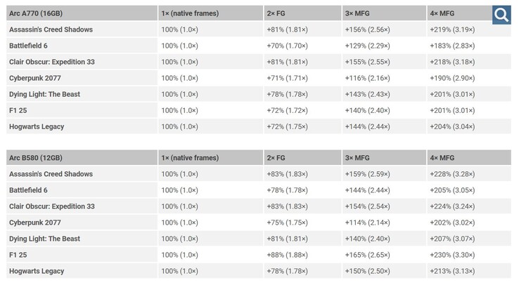 На практике независимые тесты также подтверждают значительный прирост частоты кадров. Например, в нашем прошлом материале утверждает, что включение 4× frame gen на Intel's Arc B580 или A770 примерно удвоило или более чем удвоило FPS в таких играх, как Battlefield 6. Аналогично, Внутренние бенчмарки AMD показывают, что генерация кадров FSR 3.1 примерно на 2,5-3,6× повышает FPS в реальных играх (например, 3,6× в Ratchet & Clank). Генерация кадров теперь довольно распространена в компьютерных играх высокого класса и работает даже на старых GPU благодаря DLSS/FSR и грядущему Xe Frame Gen от Intel.
