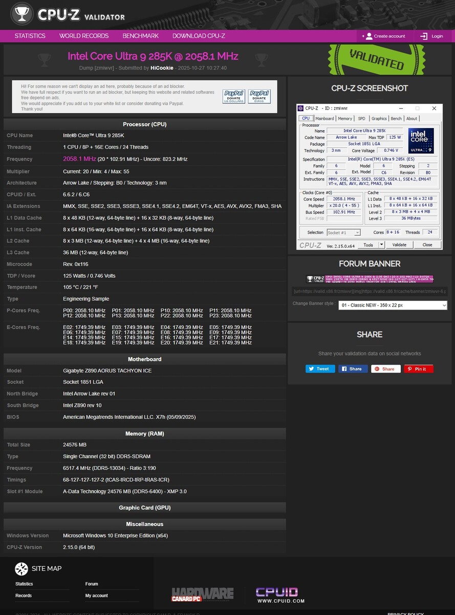 Хикоки заявил: "13K достигнуто! Огромная благодарность компании ADATA Technology за потрясающую память и контроллеру памяти Intel Core Ultra 285K - он просто феноменален". В паре с GIGABYTE Z890 AORUS TACHYON ICE мы перешагнули отметку DDR5 в 13 000 МТ/с"