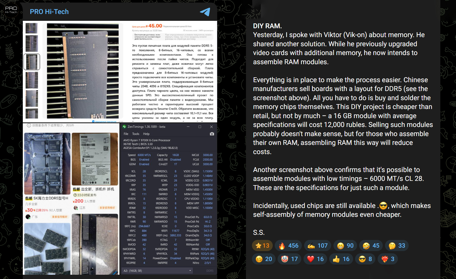 Как отмечает Pro Hi-Tech, найти эти основные детали несложно. Китайские продавцы уже предлагают готовые к пайке печатные платы DDR5. Однако такой подход "сделай сам" не поможет пользователям сэкономить много денег, по крайней мере, в нынешнем состоянии. По оценкам Pro Hi-Tech и Виктора "Vik-On", флешка объемом 16 Гб стоит около 12 000 рублей, примерно 151 доллар.