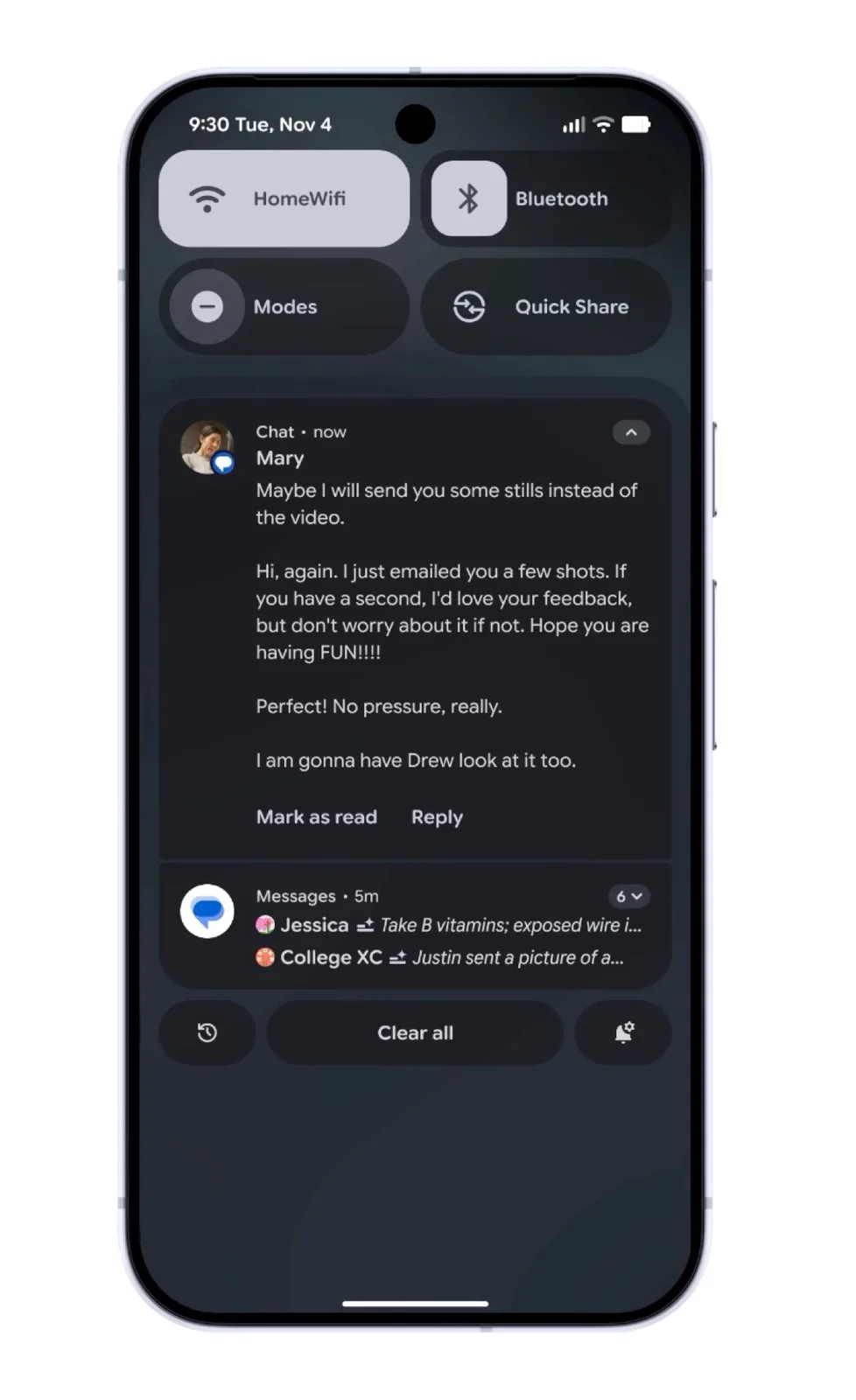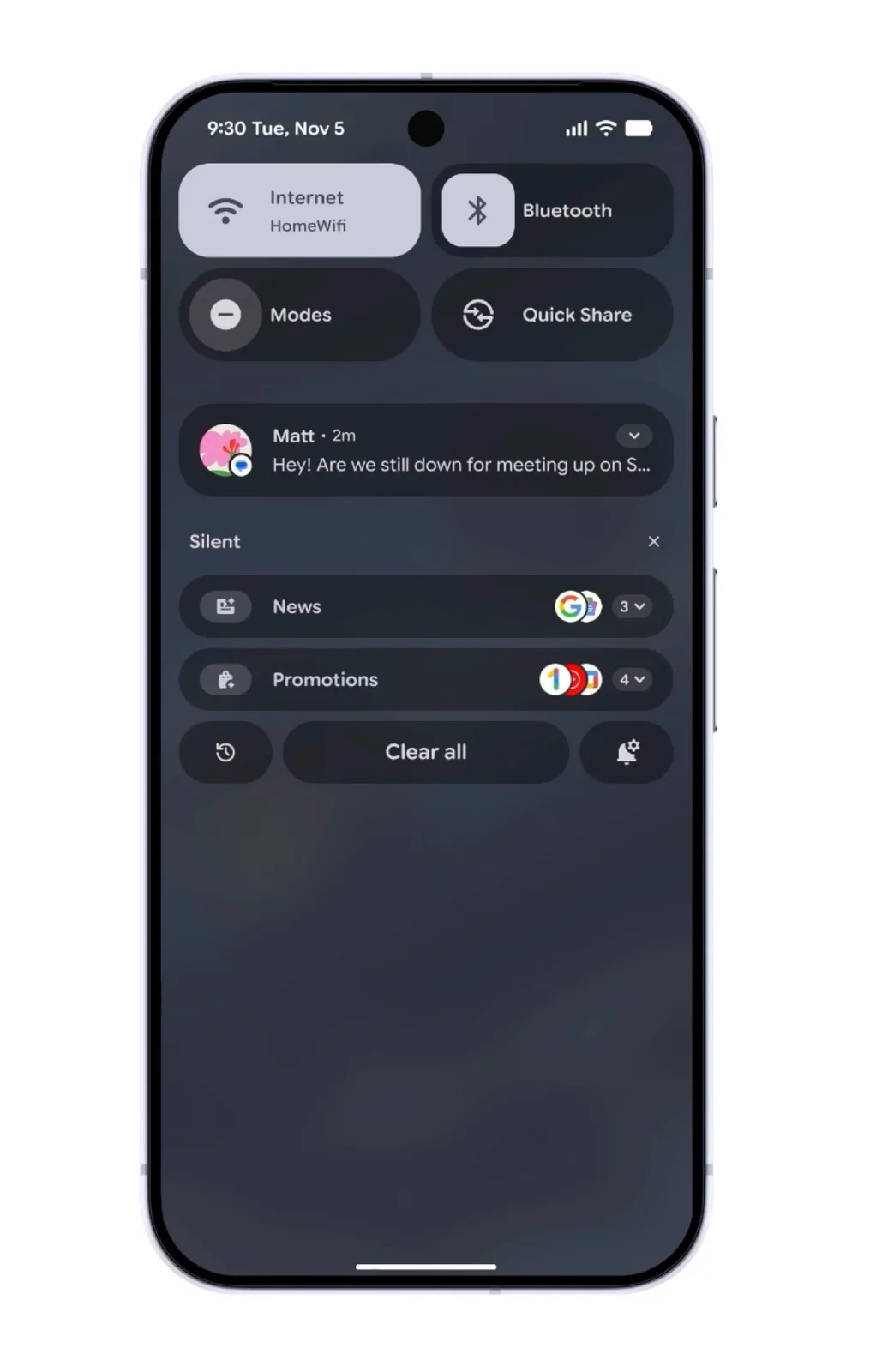 При использовании темы обновление также применит цвет к значкам приложений, не поддерживающих темы, поскольку соответствующие значки генерируются с помощью искусственного интеллекта. После обновления входящие уведомления могут автоматически суммироваться искусственным интеллектом, а низкоприоритетные сообщения, такие как реклама, группируются вместе и показываются в меньшем формате.