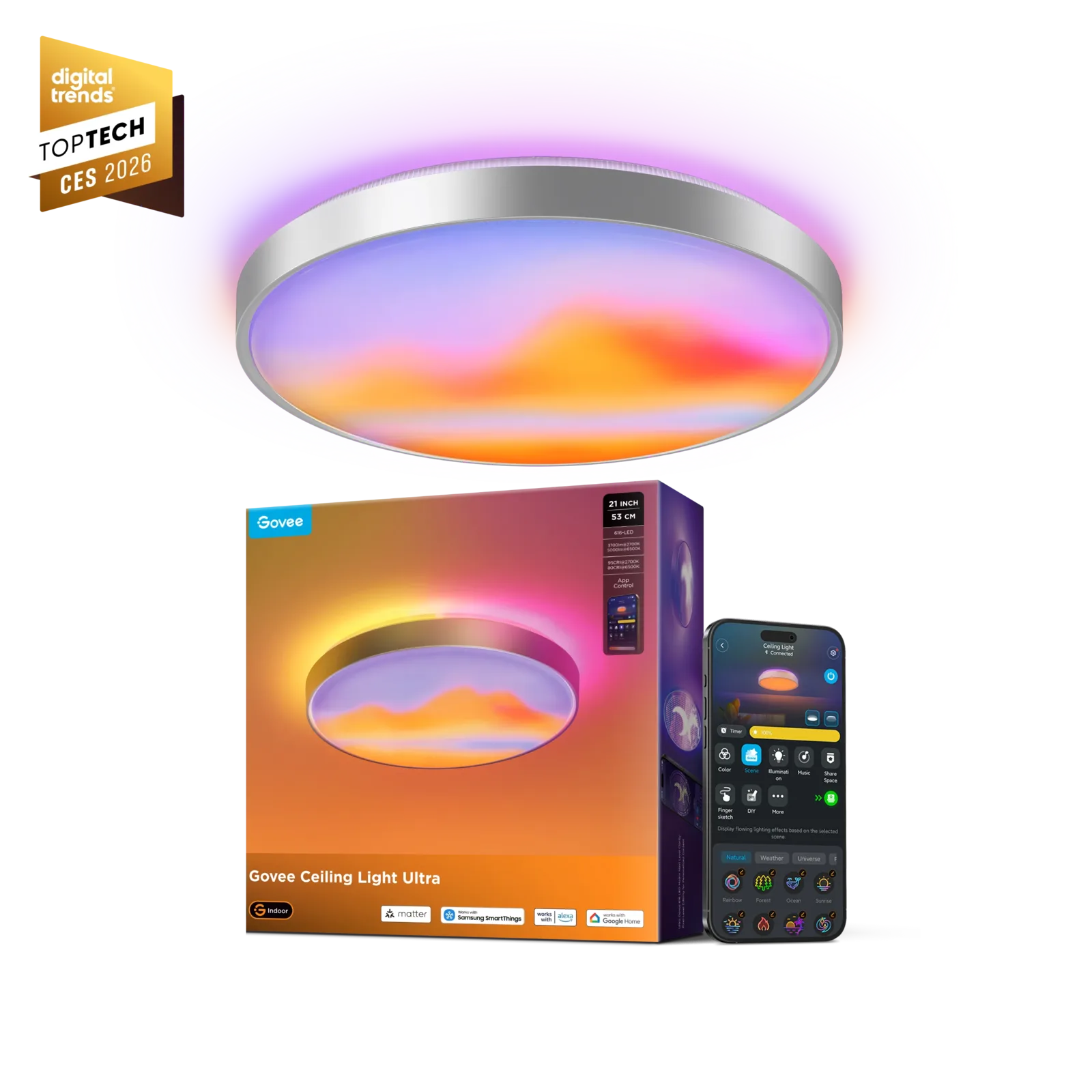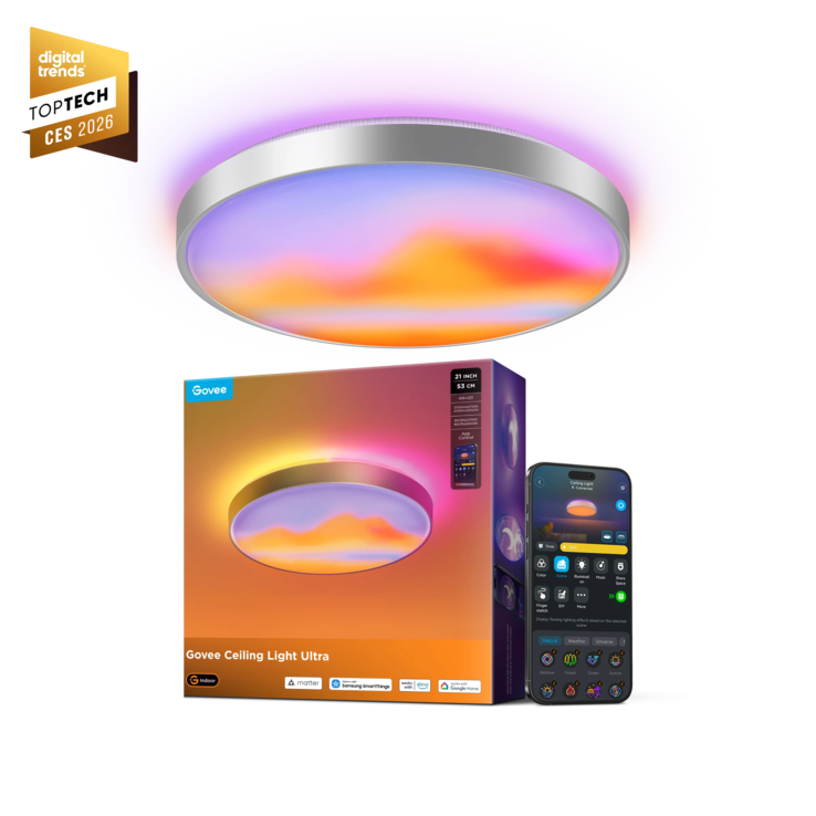 Кроме того, 21-дюймовый умный потолочный светильник Govee Ultra можно использовать в качестве обычного комнатного светильника, и, по словам производителя, он обеспечивает особенно естественное освещение, включая регулировку в зависимости от времени суток. Яркость достигает 5 000 люмен. Новый умный 21-дюймовый потолочный светильник Ultra от Govee также предлагает привычные для производителя возможности подключения к "умному дому", включая Matter, а также голосовое управление через Amazon Alexa и Google Home.
