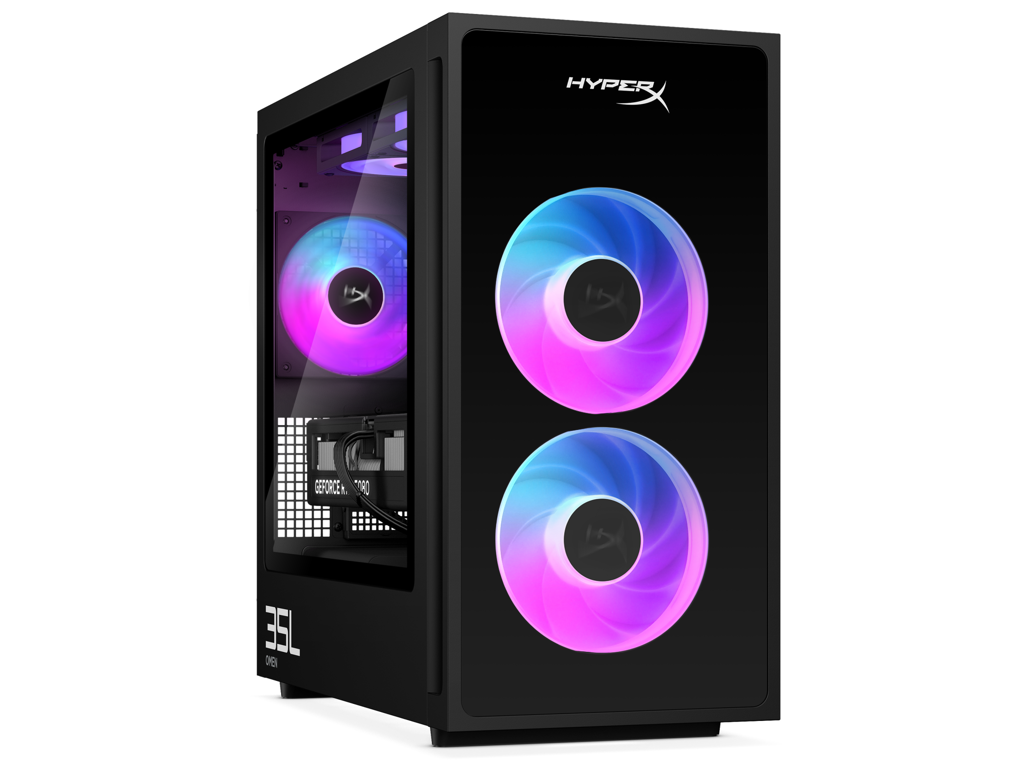 К сожалению, Omen 35L не может быть сконфигурирован с жестким диском SATA из коробки. Однако можно установить до 2 ТБ PCIe Gen 5 SSD и 2 ТБ PCIe Gen4 SSD. HP обеспечивает охлаждение системы с помощью 120-мм вентиляторов: два спереди, один сзади и два сверху. И да, здесь есть RGB.