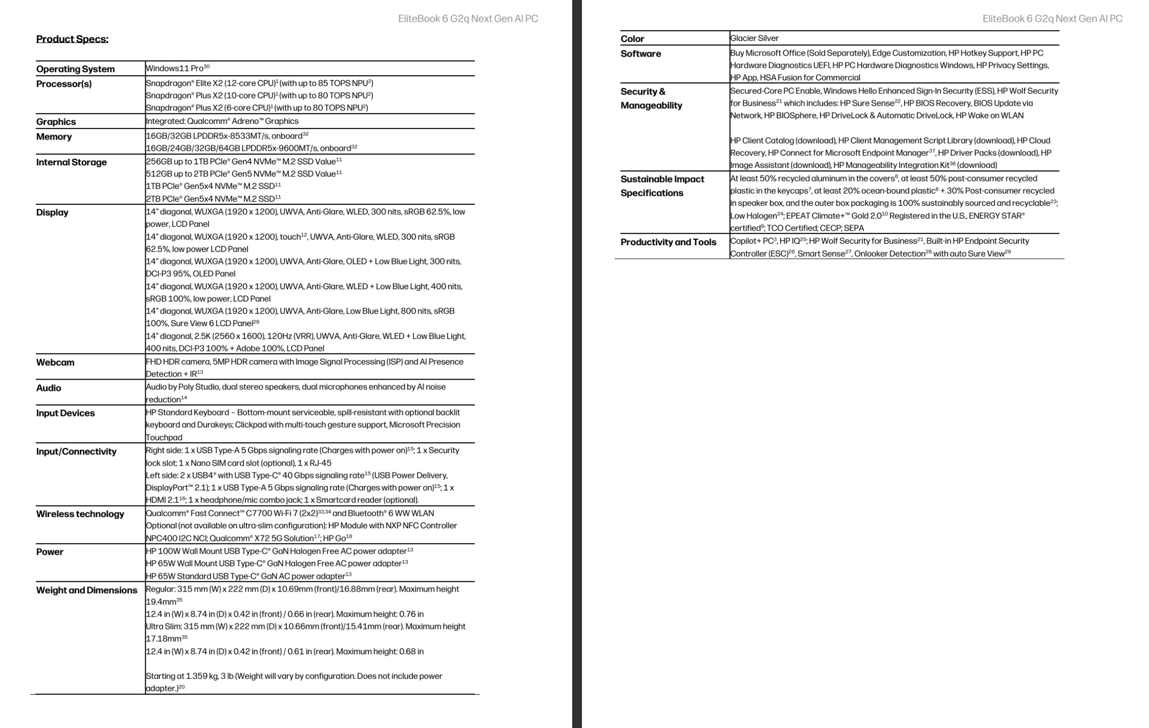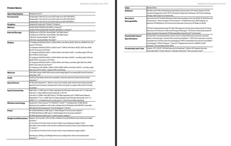 Что касается EliteBook 6 G2q, HP также предлагает его с 32 Гб оперативной памяти LPDDR5X-8533 или 64 Гб LPDDR5X-9600, в зависимости от того, какой процессор Вы выберете. Аналогично, новый 14-дюймовый ноутбук может быть оснащен до 1 ТБ памяти PCIe Gen 4 и до 2 ТБ PCIe Gen 5. За подключение Bluetooth 6 и Wi-Fi 7 отвечает модем Fast Connect C7700 от Qualcomm. Также имеется модем X72 5G, а также контроллер NFC NXP NPC400.