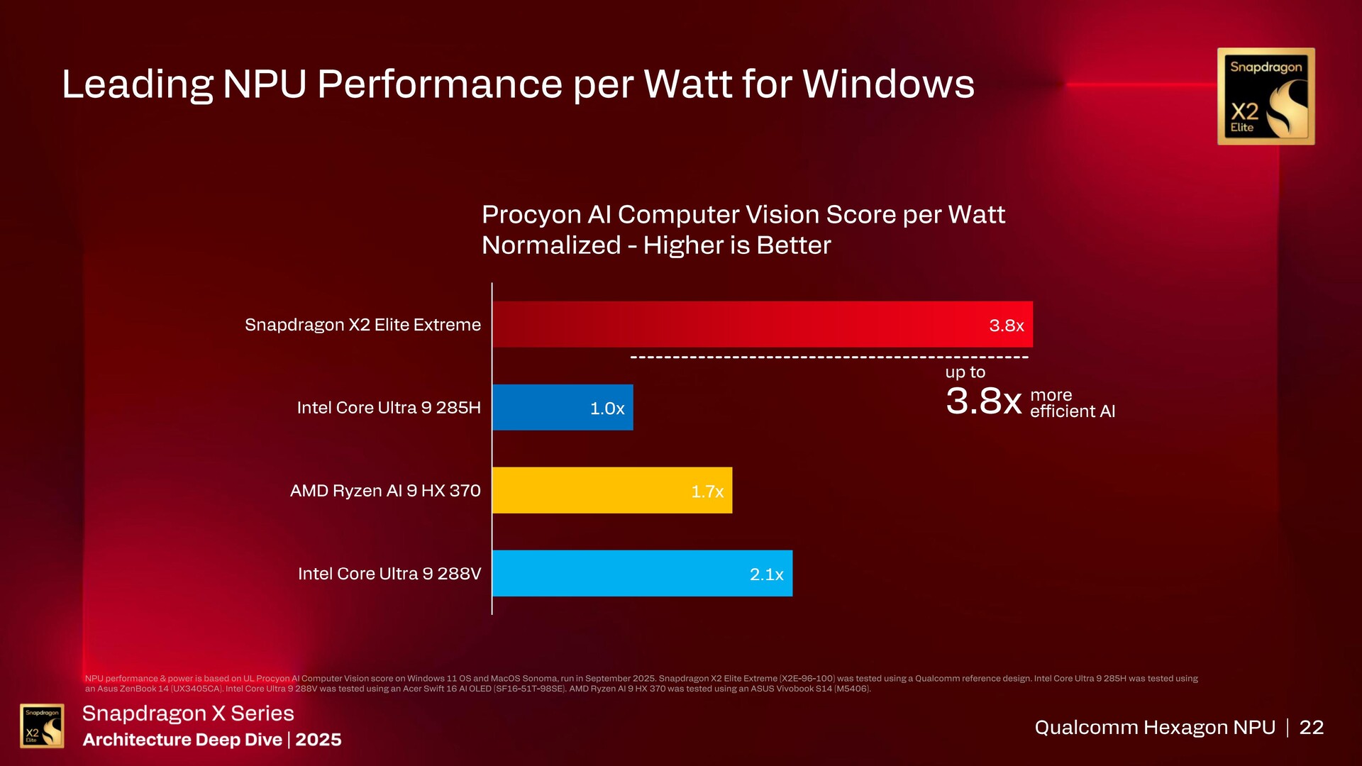 Qualcomm называет Hexagon NPU 6 в Snapdragon X2 Elite Extreme самым быстрым в мире, с 5,7-кратным увеличением производительности и 3,8-кратным увеличением эффективности по сравнению с Core Ultra 9 285HnPU в Procyon AI Computer Vision.