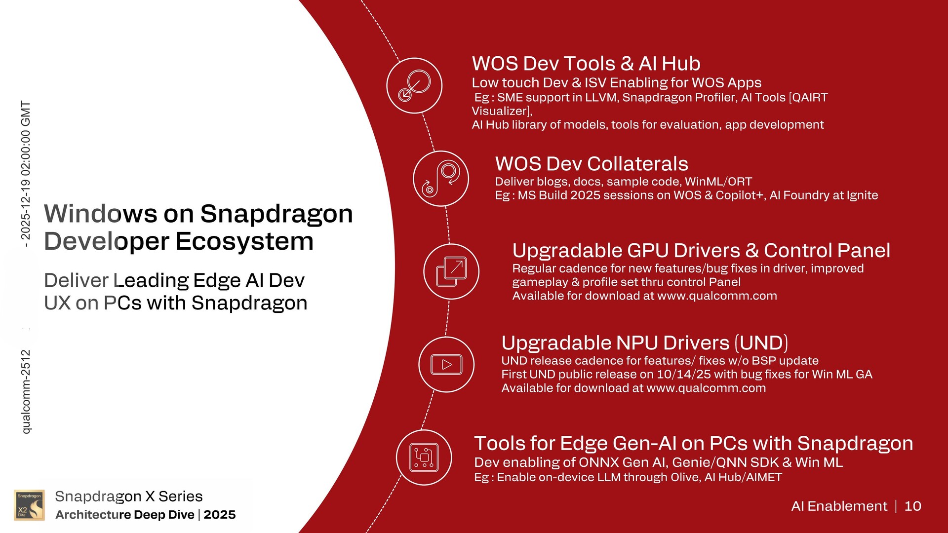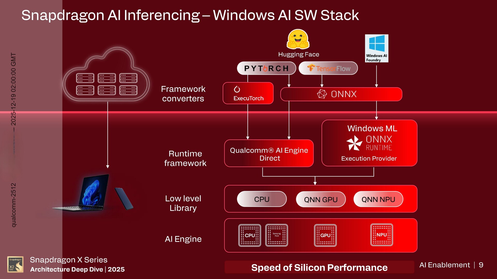 Qualcomm утверждает, что Snapdragon AI inferencing работает с программным стеком Windows AI, обеспечивая агентурные рабочие нагрузки нового поколения. Поддерживаемые открытые ML-фреймворки включают PyTorch и TensorFlow.