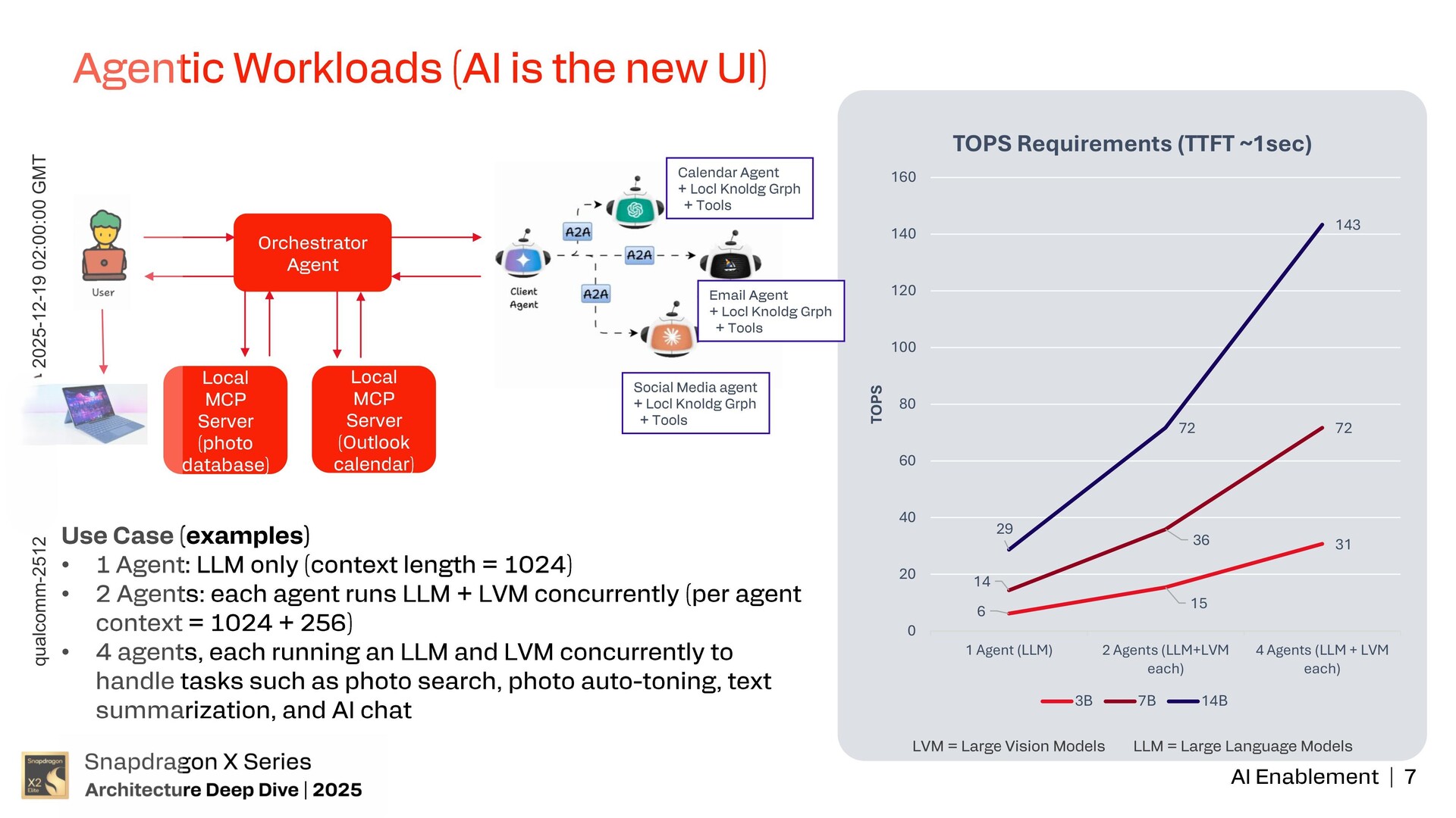 Компания Qualcomm рассказала о том, что для одного агента LLM с длиной контекста 1024 и 14 миллиардами параметров (14B) потребуется до 143 TOPS вычислительной мощности ИИ, в то время как для агентских сценариев с двумя (3B) или четырьмя агентами (7B), каждый из которых работает одновременно с LLM и LVM, может потребоваться до 72 TOPS.