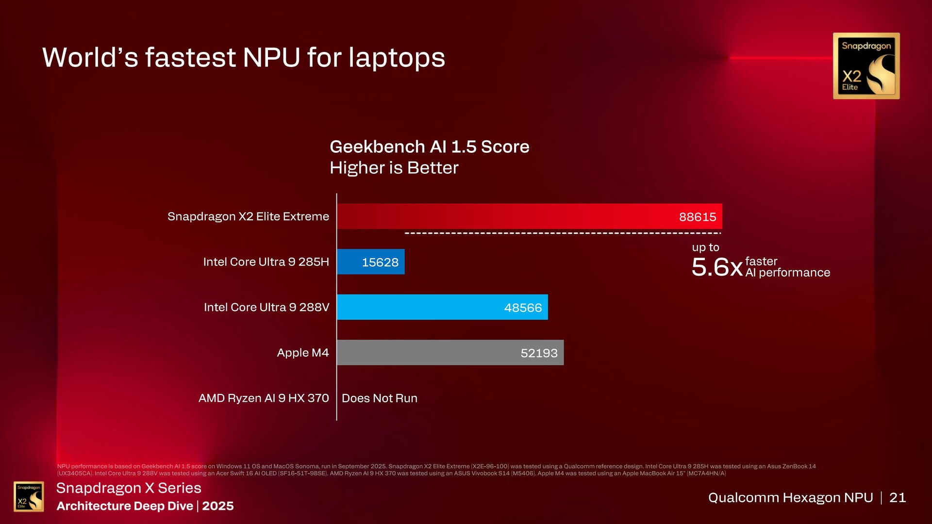 По данным Geekbench AI, NPU Hexagon 6 почти на 70% быстрее, чем NPU в Apple M4 и опережает Core Ultra 9 288V на 82,4%.