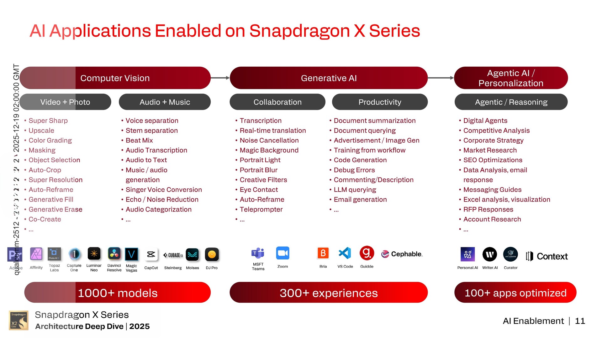 Процессоры для ноутбуков Snapdragon X серии SoCs в настоящее время поддерживают более 1000 моделей и более 300+ опытов, охватывающих аудио, видео, фото, генеративный ИИ, агентный ИИ и рассуждения.
