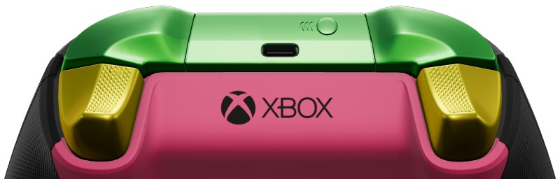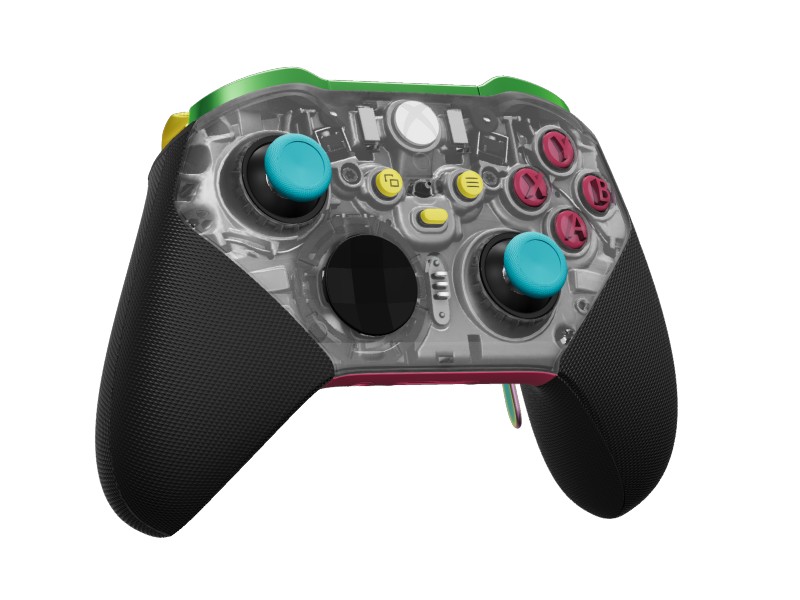 Тема High on Life 2 Design Lab представляет собой яркий, красочный вариант контроллера Xbox Series X. Спереди полупрозрачная лицевая панель сочетается с черными рукоятками, а голубые джойстики, розовые кнопки ABXY и желтые кнопки меню создают сильный контраст. На задней панели темно-розовый задний корпус сочетается с зелеными бамперами и золотыми триггерами. Это красочный редизайн, который берет начало в громкой, хаотичной эстетике High on Life 2.