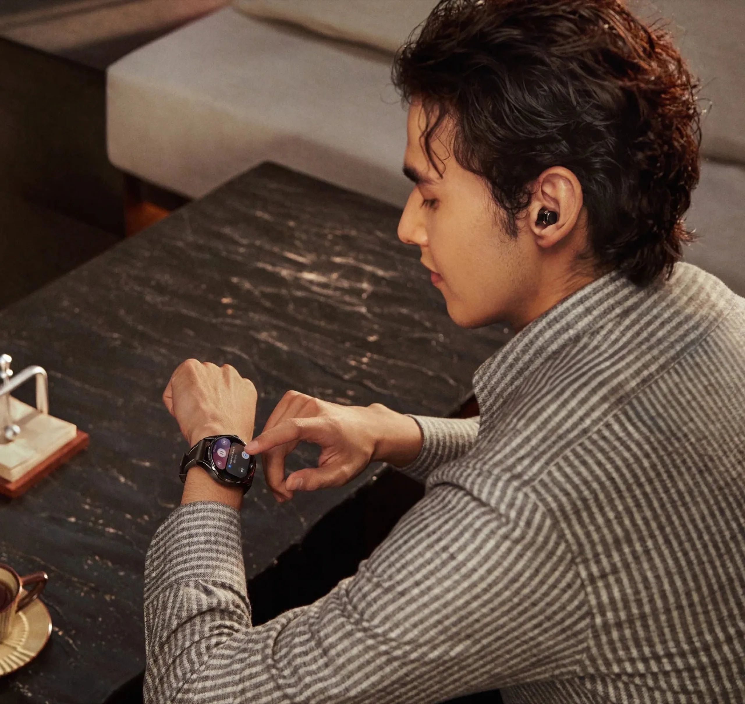 Титановый корпус, как утверждается, значительно более устойчив к царапинам, чем его предшественник. Хотя заводную головку на правой стороне нельзя повернуть, нажатие на нее переворачивает дисплей вверх, чтобы можно было снять наушники. Умно: Наушники автоматически определяют, слева или справа их носят. Они поддерживают активное шумоподавление. Воспроизводимую музыку можно поставить на паузу, прикоснувшись к задней части наушников
