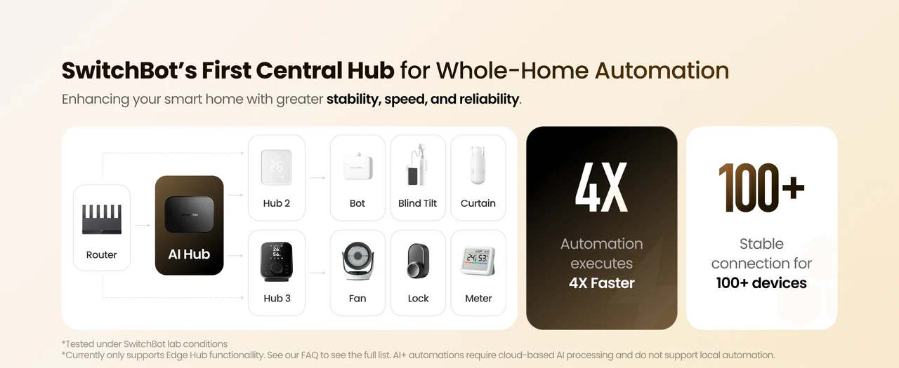 По словам представителей SwitchBot, на борту имеются различные функции ИИ, включая распознавание лиц, домашних животных и объектов для прямых трансляций с камер. Также поддерживаются локальные VLM-автоматы, позволяющие управлять исполнительным механизмом в зависимости от распознанного объекта. В качестве примера можно привести SwitchBot, который включает свет, когда человек лежит на диване. Можно распознавать различные типы поведения и запускать интеллектуальные процедуры. В рекламе "умного" домашнего концентратора заявлена производительность ИИ на уровне 6 TOPS.