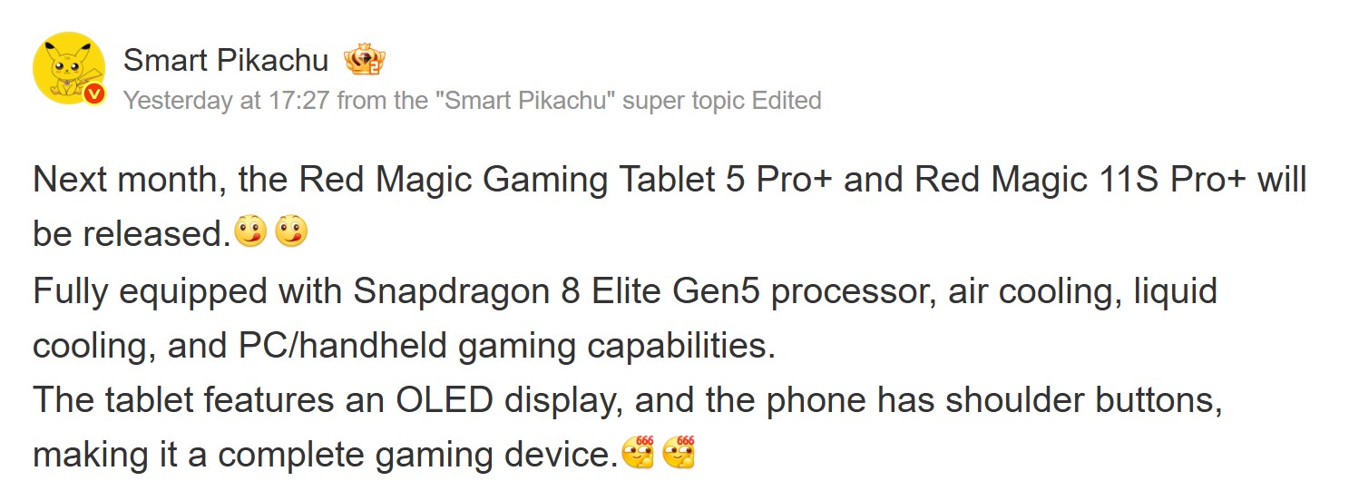 Новое сообщение от Smart Pikachu, известного автора утечек, говорит о том, что игровой планшет не за горами. Его запуск запланирован на май 2026 года, а компания RedMagic обычно выпускает свои продукты на мировой рынок вскоре после их дебюта в Китае.