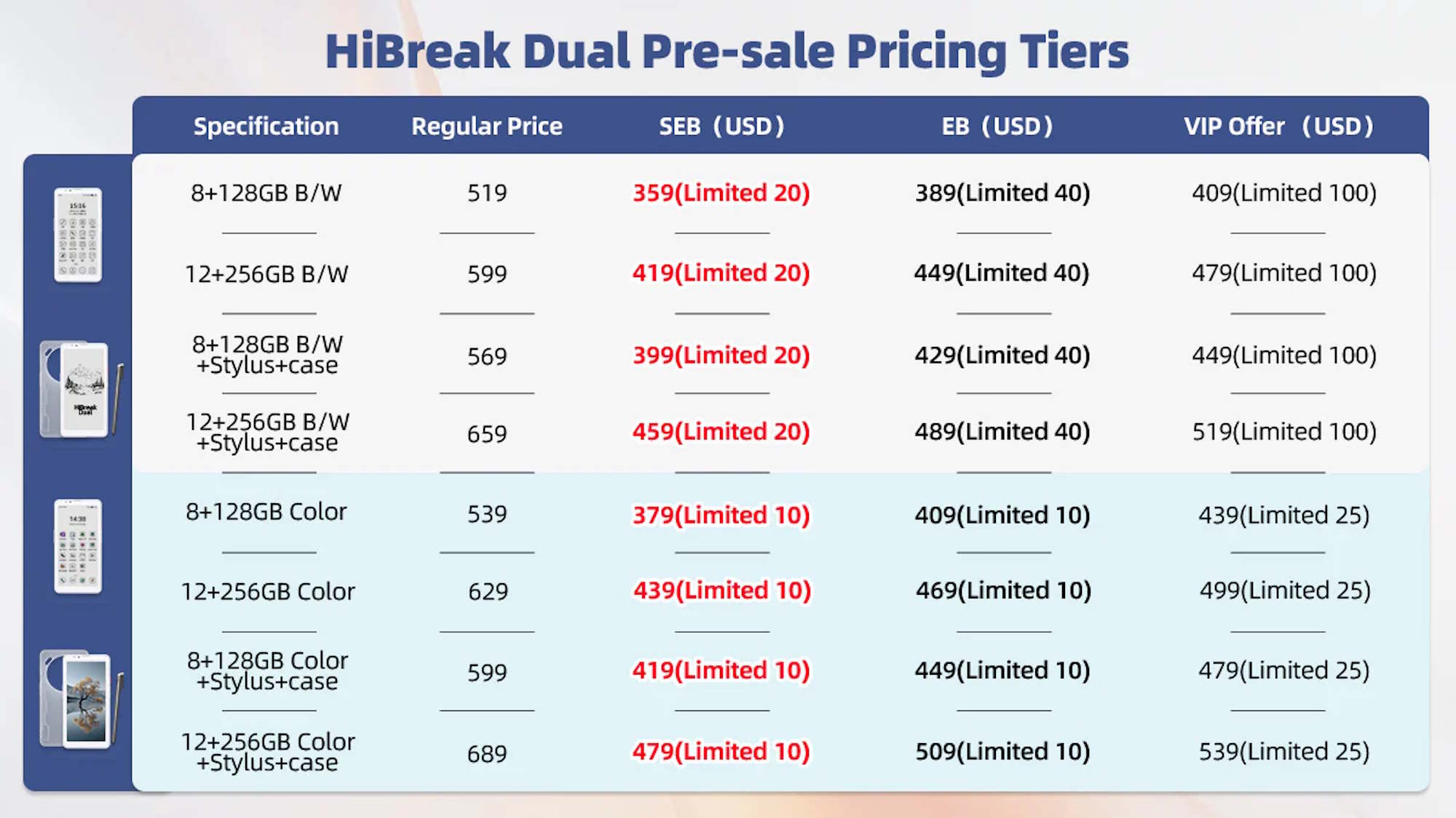 Смартфон предлагается на в восьми вариантах. Он доступен с 8 или 12 Гб оперативной памяти и 128 или 256 Гб памяти для хранения данных, причем каждая конфигурация также предлагается в варианте с цветным E Ink-дисплеем или без него. Покупатели могут заказать как сам HiBreak Dual E-Ink, так и комплект с чехлом и стилусом. Заявленная обычная розничная цена варьируется от $519 до $689, хотя ожидается, что цены на предварительный заказ будут включать существенные скидки. Скорее всего, они будут ограничены в основном количеством, а не временем. Ожидается, что первые 20 экземпляров базовой версии будут продаваться по цене $359, после чего цена вырастет до $389, а затем до $409. Топовая версия с 12 Гб, 256 Гб, стилусом и защитным чехлом будет стоить $479, $509 и $539.