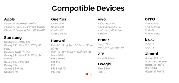 Хотя Insta360 рекламирует Snap с iPhone, новый аксессуар также совместим со смартфонами Android, оснащенными портами USB Type-C. Полный список официально совместимых устройств Вы найдете на изображении ниже. Стоимость Insta360 Snap начинается от $79,99 и возрастает до $89,99 со встроенным фонарем. Пожалуйста, посетите сайт Insta360 для получения более подробной информации.