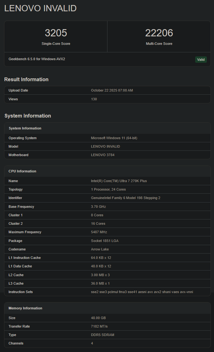 Он набрал 3 205 и 22 206 баллов в тестах Geekbench 6.5 одноядерном и многоядерном тестах, соответственно. Core Ultra 7 270K Plus имеет 24 ядра (8 P + 16 E), 24 потока и тактовую частоту 5,4 ГГц. Он питает неуказанный ПК Lenovo с 48 ГБ оперативной памяти DDR5-7182 (DDR5-7200) под управлением Windows 11. Результаты теста Geekbench показывают, что он тестировался вместе с GeForce RTX 5090 D, графическим процессором только для Китая.