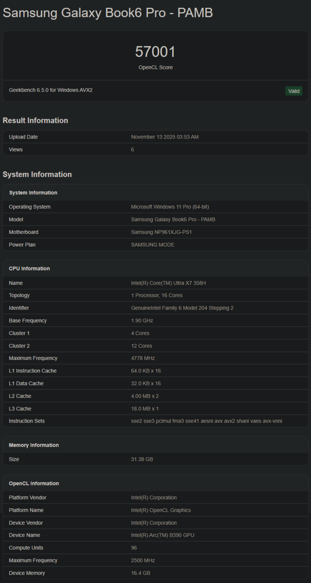Core Ultra X7 358H оснащен iGPU Arc B890 с 96 вычислительными блоками (12 EU). Он набирает 57 001 балл в бенчмарке OpenCL от Geekbench и имеет тактовую частоту 2,5 ГГц. Это на 38% больше производительности, чем у Arc 140T (в среднем 41 013 баллов), установленных в процессорах Arrow Lake. По сравнению с процессором Panther Lake Arc 140V (29598), это почти 92%-ное улучшение.