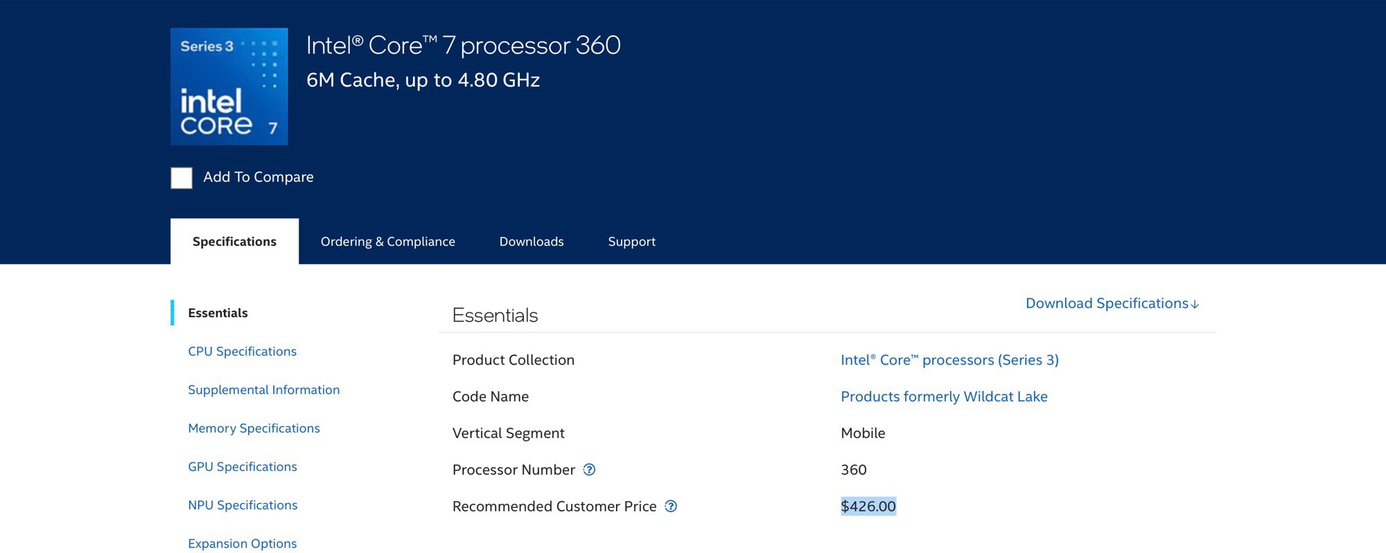 Согласно этой информации, ноутбук Intel Core 5 320 стоит 340 долларов, а за Core 7 360. Эти цены указаны при покупке 1 000 единиц; при покупке большего количества возможны скидки. Таким образом, чипы получились неожиданно дорогими, поскольку несколько лет назад процессоры Intel для ноутбуков, ориентированные на производительность, предлагались по сопоставимым ценам. Intel не называет цены на более быстрые чипы "Panther Lake"