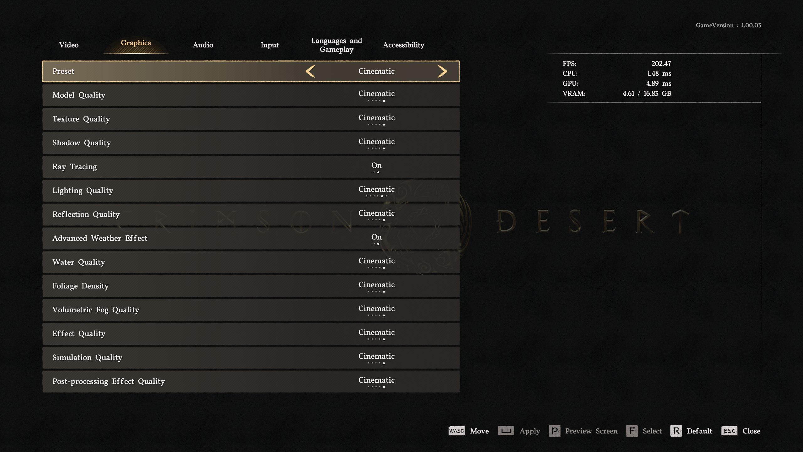 Трассировка лучей, которая находится в опциях графики, включается, начиная с пресета Medium. Говоря о пресетах, разработчики включили в игру шесть из них, начиная с минимального и заканчивая кинематографическим. Тот, кто предпочитает настраивать качество вручную, также может сделать это в меню Графика. Одна из практичных функций - встроенный индикатор VRAM, который помогает оценить потребности в видеопамяти. Изменения настроек не требуют перезагрузки.