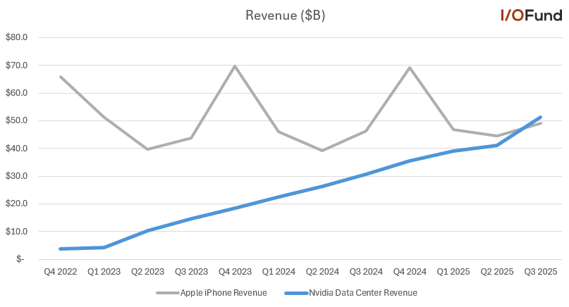 Согласно данным, предоставленным Фондом I/O (через Бет Киндиг на сайте X), доход Nvidia от ЦОД в 3 квартале 2025 года превзошел Appleдоход от iPhone доход от продаж iPhone впервые в истории.