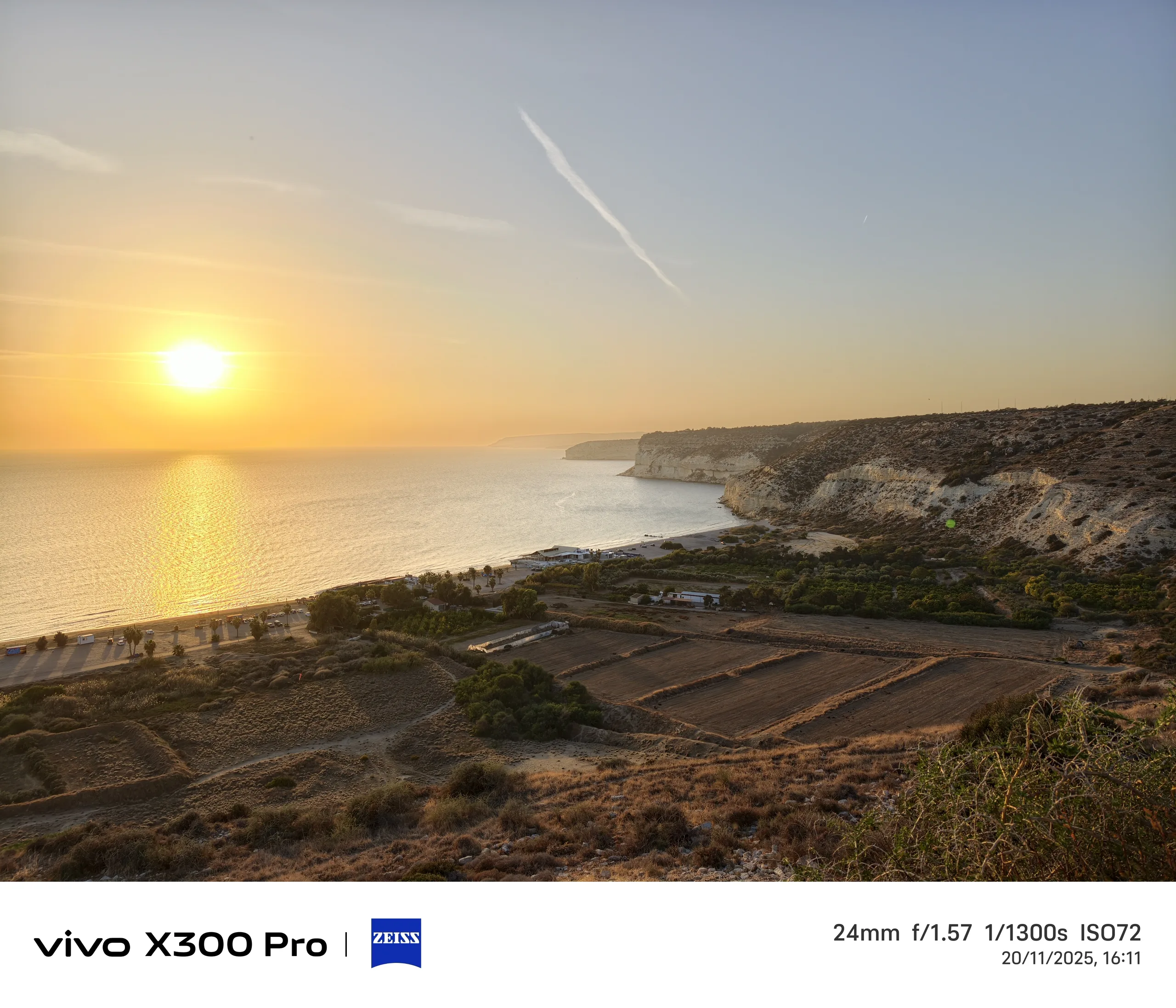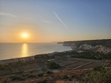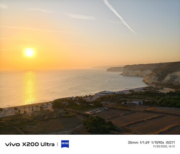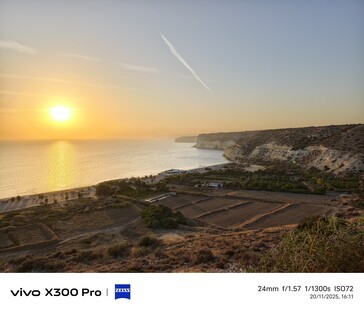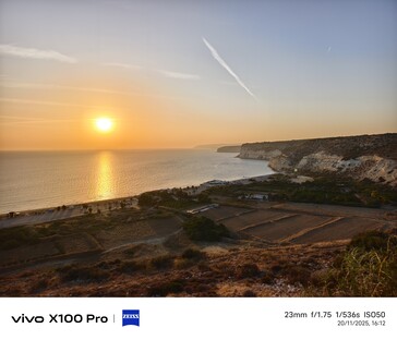Во втором примере мы возвращаемся в Курион и смотрим на заходящее солнце и пляж Курион. 1-дюймовый сенсор камеры Vivo X100 Pro обеспечивает наиболее красочную передачу заката, но не обязательно самую точную, поскольку солнце в тот момент было не таким уж красным. Несмотря на самый большой сенсор и самую длинную выдержку, эта фотография также является самой темной.