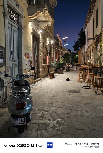 На первый взгляд, переэкспонированные лампы на Galaxy S23 Ultra выделяются, в то время как три модели Vivo гораздо лучше держат блики под контролем. Vivo X200 Ultra показывает наибольшее количество деталей на удаленных объектах, что неудивительно, учитывая его 35 мм фокусное расстояние. Оглядываясь назад, можно сказать, что этот результат подтверждает переход Vivo от IMX989: несмотря на меньший размер сенсора, Vivo X100 Pro не может идти в ногу со временем, даже на близком расстоянии. Например, слева от мотоцикла Vivo X300 Pro показывает больше деталей, чем X100 Pro и X200 Ultra.