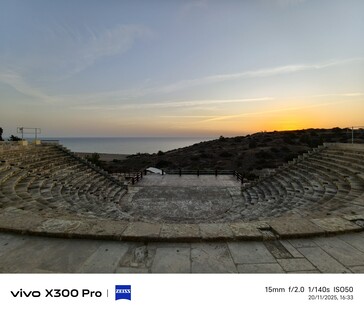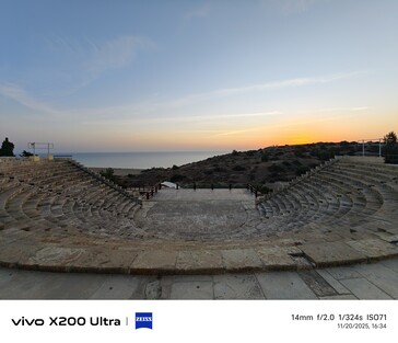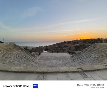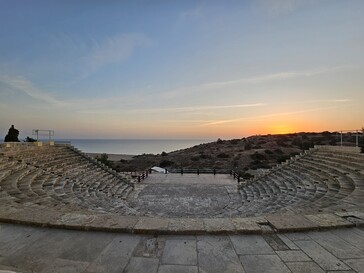 Для второго сверхширокоугольного примера мы перенесемся на 81 километр в Куриум (Курион), древнее археологическое место с прекрасным видом на окрестности. В ноябре здесь обычно мало что происходит, поэтому некоторые места могут показаться почти пустынными, например, амфитеатр на закате. В это сравнение также включен телефон Samsung 2023 года в линейке сверхширокоугольных телефонов, показанный в правом нижнем углу на каждом изображении.