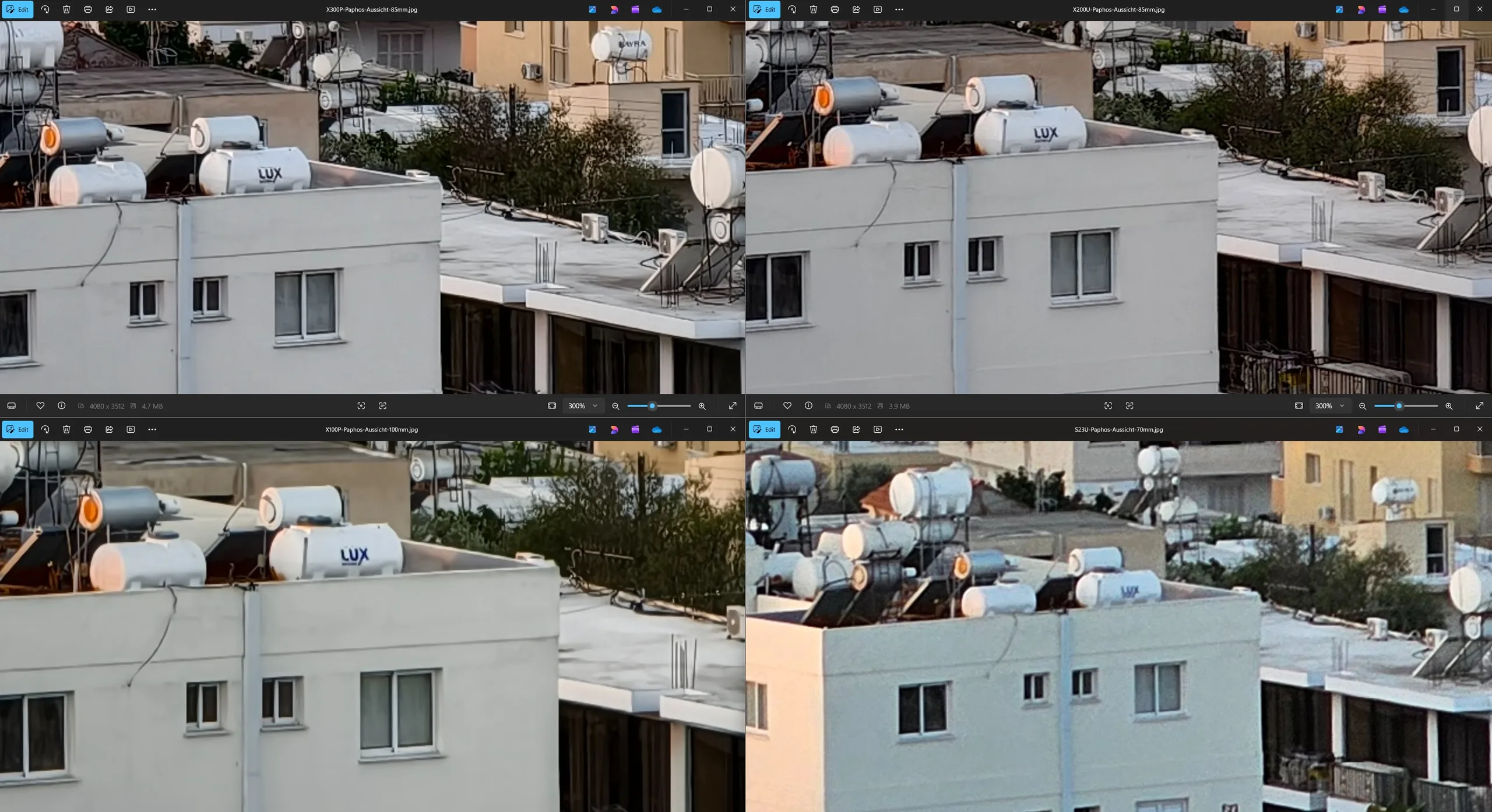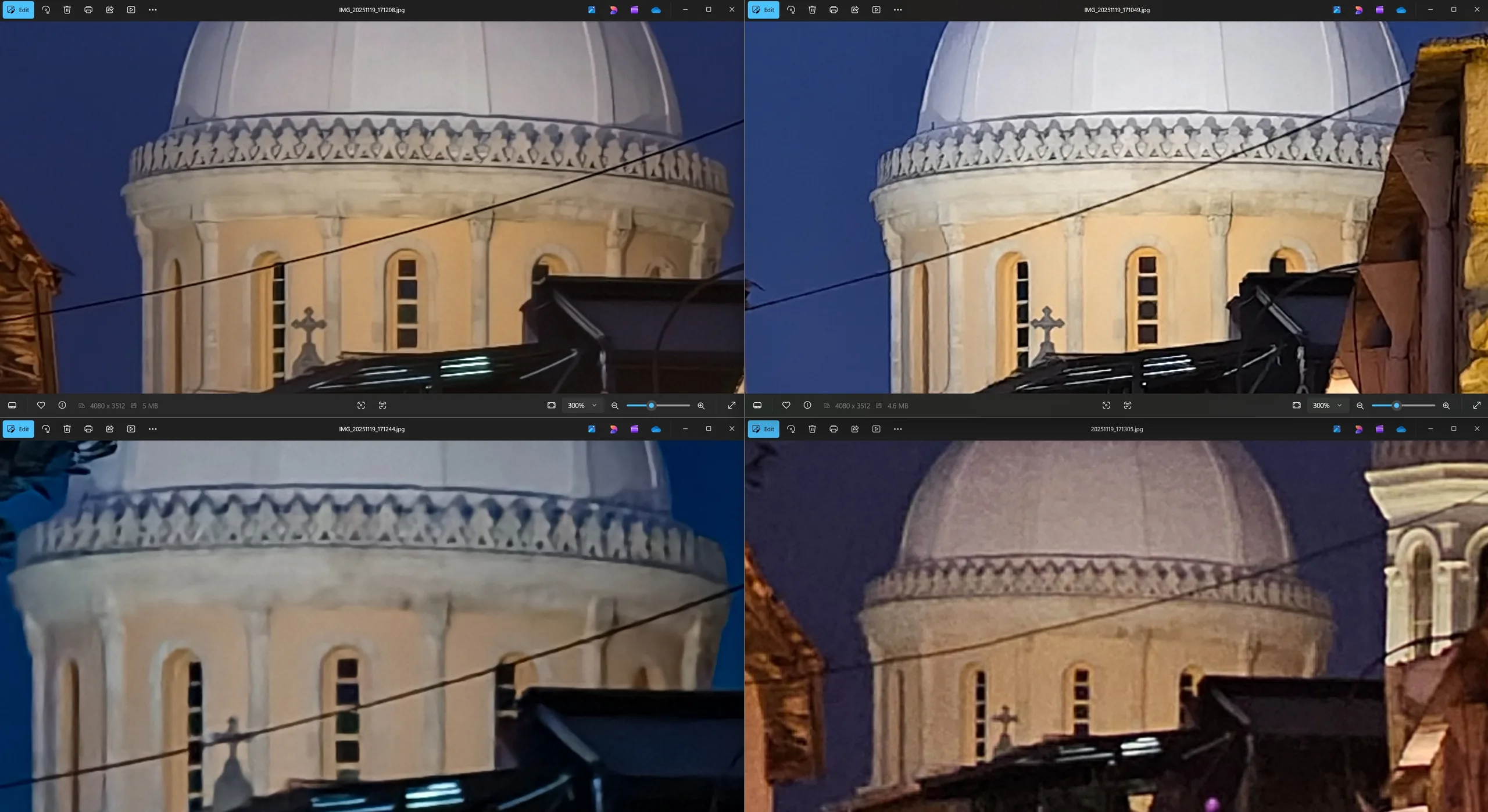 Церковь Святого Лазаря в Ларнаке послужила эталонным объектом для первого сверхширокоугольного сравнения между моделями Vivo. Я прошу прощения за немного разные углы съемки в каждом случае, но победитель должен быть достаточно очевиден независимо от этого. Vivo X200 Ultra не только предлагает самое широкое поле зрения и является единственной моделью, способной запечатлеть церковь целиком, но и его передача более отдаленных деталей явно самая резкая. Поэтому даже при дневном свете он является явным победителем при 300-кратном увеличении, хотя Vivo X300 Pro все же заметно лучше Vivo X100 Pro.