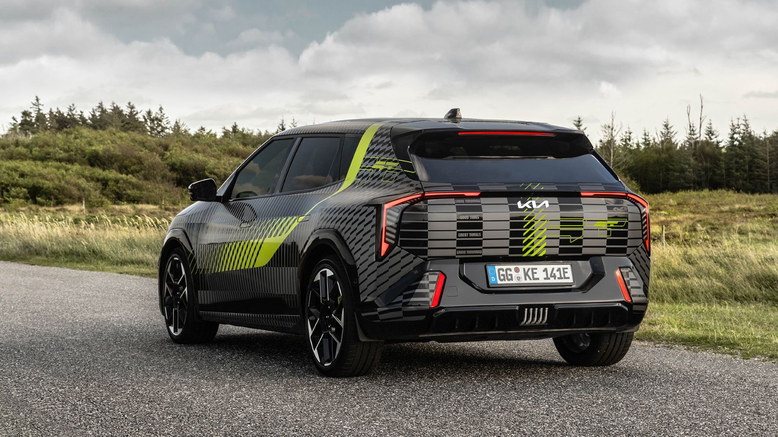 Теперь, в пресс-релизе на сайте https://www.press-eu.kia.com/document/633#/latest-news/kia-reveals-dedicated-gt-foil-design-capturing-motion-and-light о новом GT Wrap, Kia демонстрирует хэтчбек EV4 GT. GT Wrap - это черная, серая и неоново-зеленая пленка, которая используется для маскировки электрических прототипов GT марки. Kia указывает, что геометрический дизайн намекает на скорость ее моделей GT, заявляя, что он затрагивает "эмоциональный характер ее (Kia) высокопроизводительных автомобилей". На изображениях также видны изготовленные на заказ колесные диски этого прототипа.