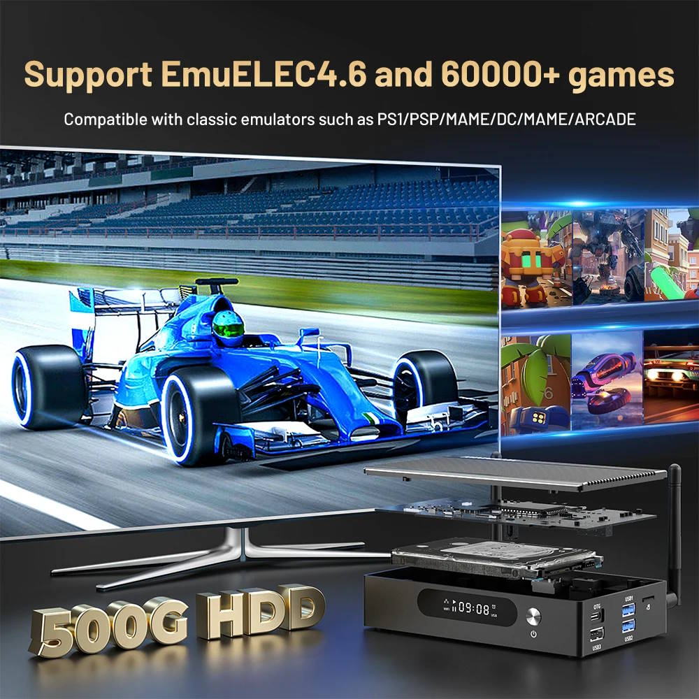 KinHank Super Console X3 Pro работает на базе процессора Amlogic S905X3 с четырьмя ядрами Cortex-A55 и 4 Гб оперативной памяти. Эта доступная игровая система может работать на EmuELEC или на Android 9 в качестве операционной системы, что означает, что эта маленькая коробочка может также использоваться в качестве медиаплеера для старых телевизоров, у которых нет доступа к интеллектуальным функциям или магазину приложений.