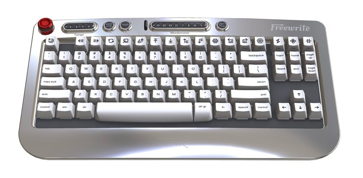 На первый взгляд, Freewrite Wordrunner выглядит как полноразмерная механическая клавиатура без нумпада. Ее отличительной особенностью являются два дисплея в верхней части устройства ввода. На одном из них отображается таймер для коротких записей. Длительность можно устанавливать вручную после каждого перезапуска.