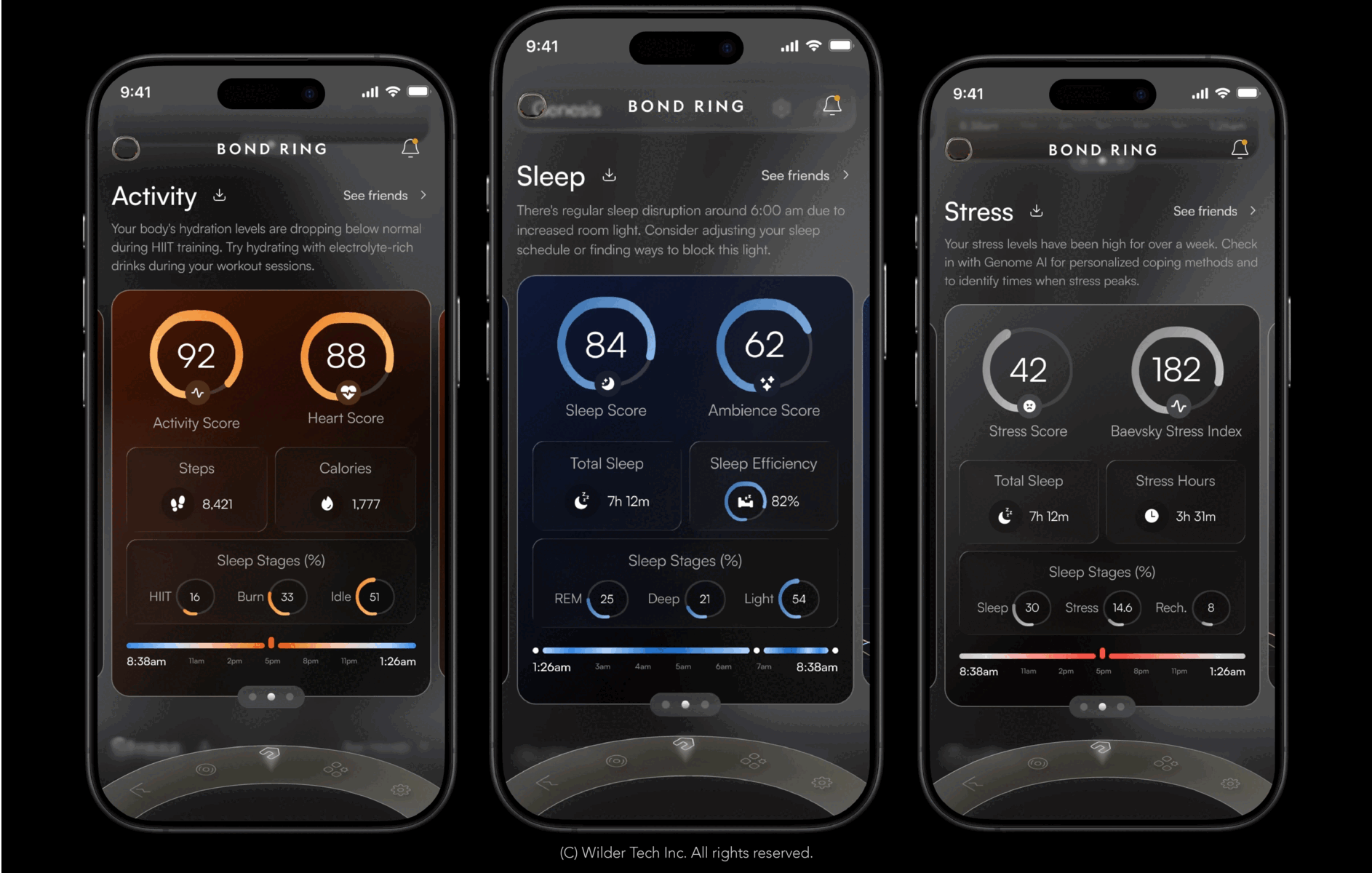 Большое количество датчиков, якобы встроенных в кольцо, также вызывает опасения. Компания утверждает, что Bond Ring может записывать ЭКГ и измерять динамику артериального давления, температуру тела, пульс, насыщенность кислородом (SpO2), вариабельность сердечного ритма (HRV) и максимальное поглощение кислорода (VO2 max). Он также якобы измеряет состав тела, т.е. количество жира, мышц, скелетной массы и содержание воды в организме. Это только внутренние датчики, поскольку маленькое кольцо, как утверждается, также оснащено датчиками ультрафиолетового облучения, температуры окружающей среды, интенсивности освещения и уровня шума.