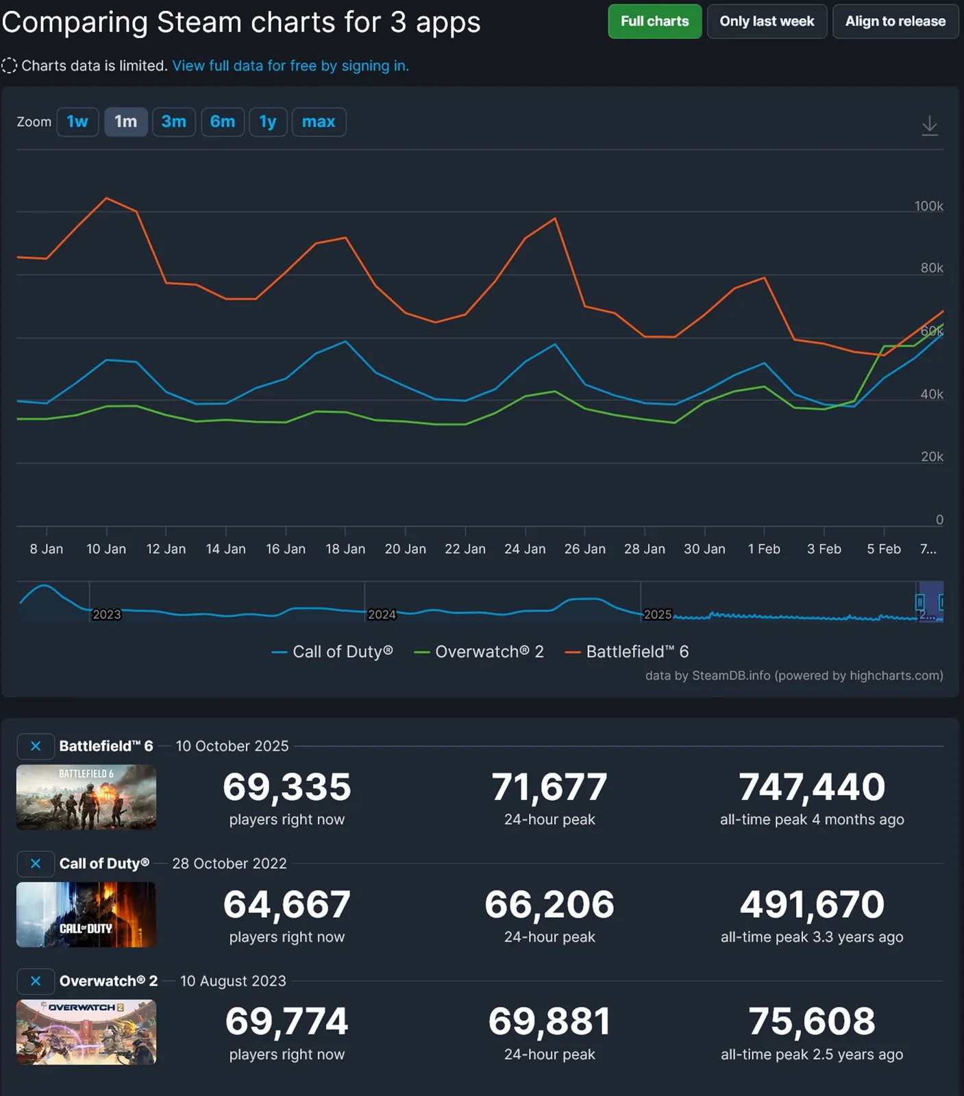 Добавление непрерывного повествования устраняет одно из критических замечаний в адрес игры. Ожидание обновлений привело к тому, что пиковое количество игроков Overwatch за 24 часа превысило 69 000 человек, что является самым высоким показателем с момента дебюта на Steam. Хотя Battlefield 6 с тех пор восстановилась и вырвалась вперед на 71 000, это, тем не менее, заметное событие. Между тем, Call of Duty, в которую входят Black Ops 7отстает от нее с пиком в 66 206 игроков.