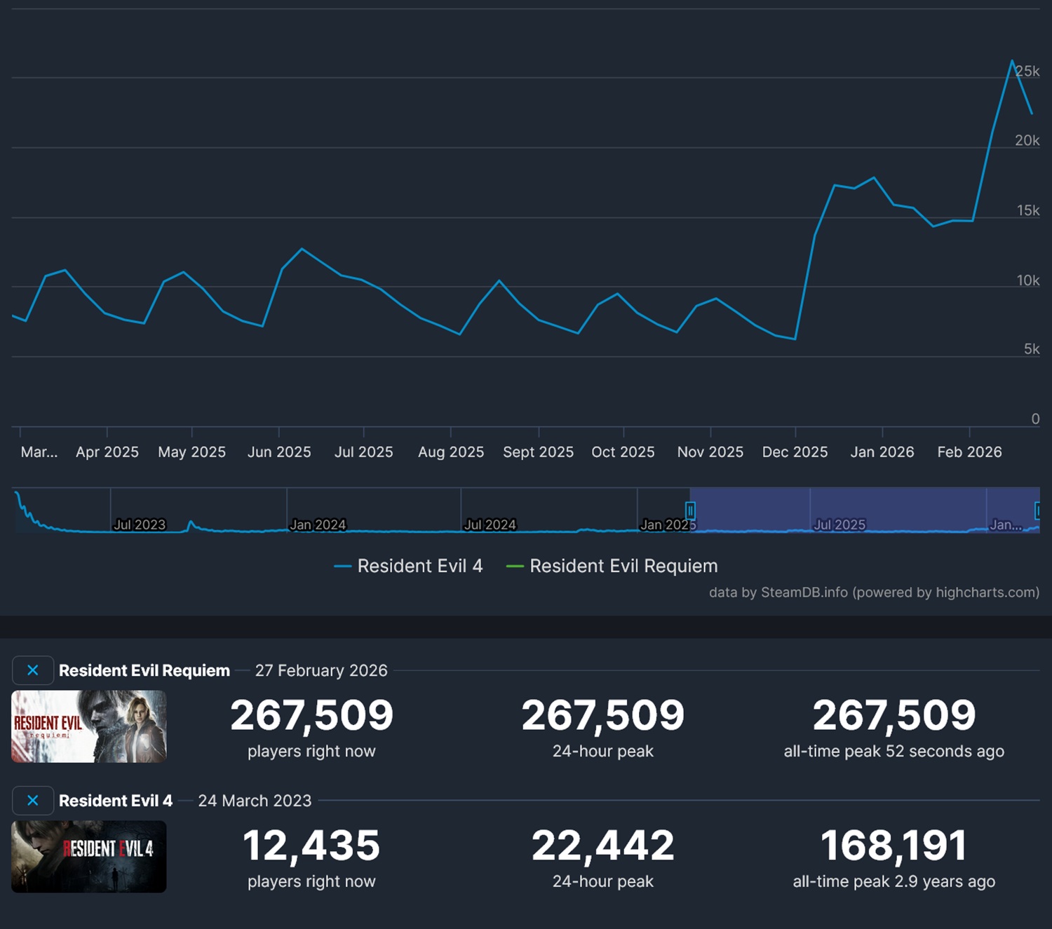 Количество игроков Resident Evil Requiem в Steam побило рекорд RE4 в 168K через 30 минут после выхода