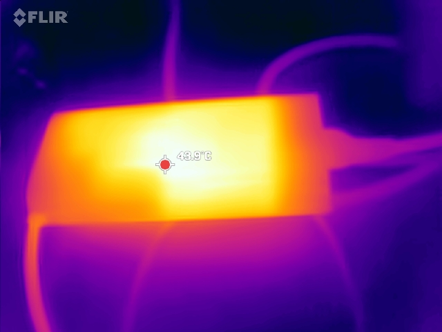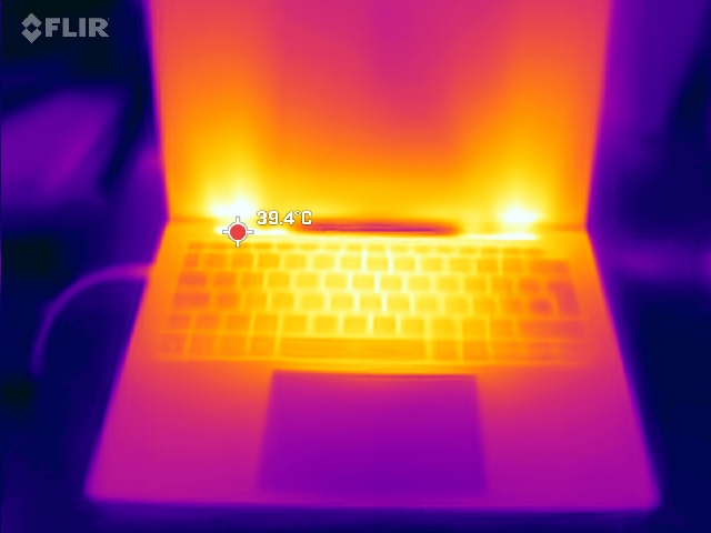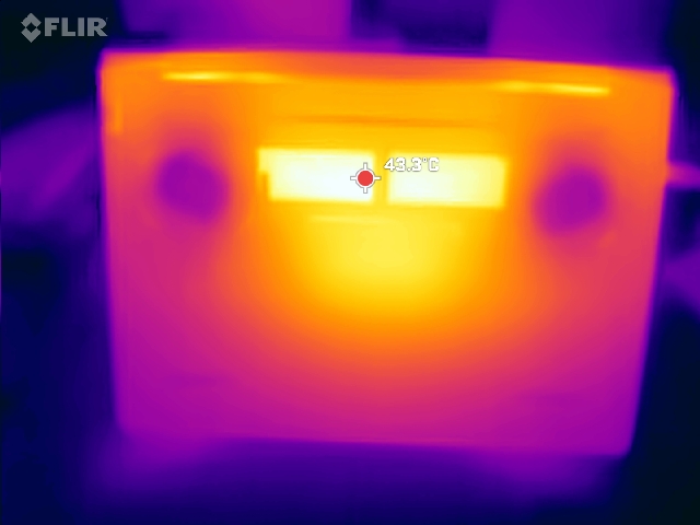 В стресс-тесте горячая точка достигает 43 °C на нижней стороне, около центра по направлению к дисплею. Центральная область клавиатуры также нагревается, но обе стороны остаются прохладными, а подставки для ладоней - комфортно прохладными.