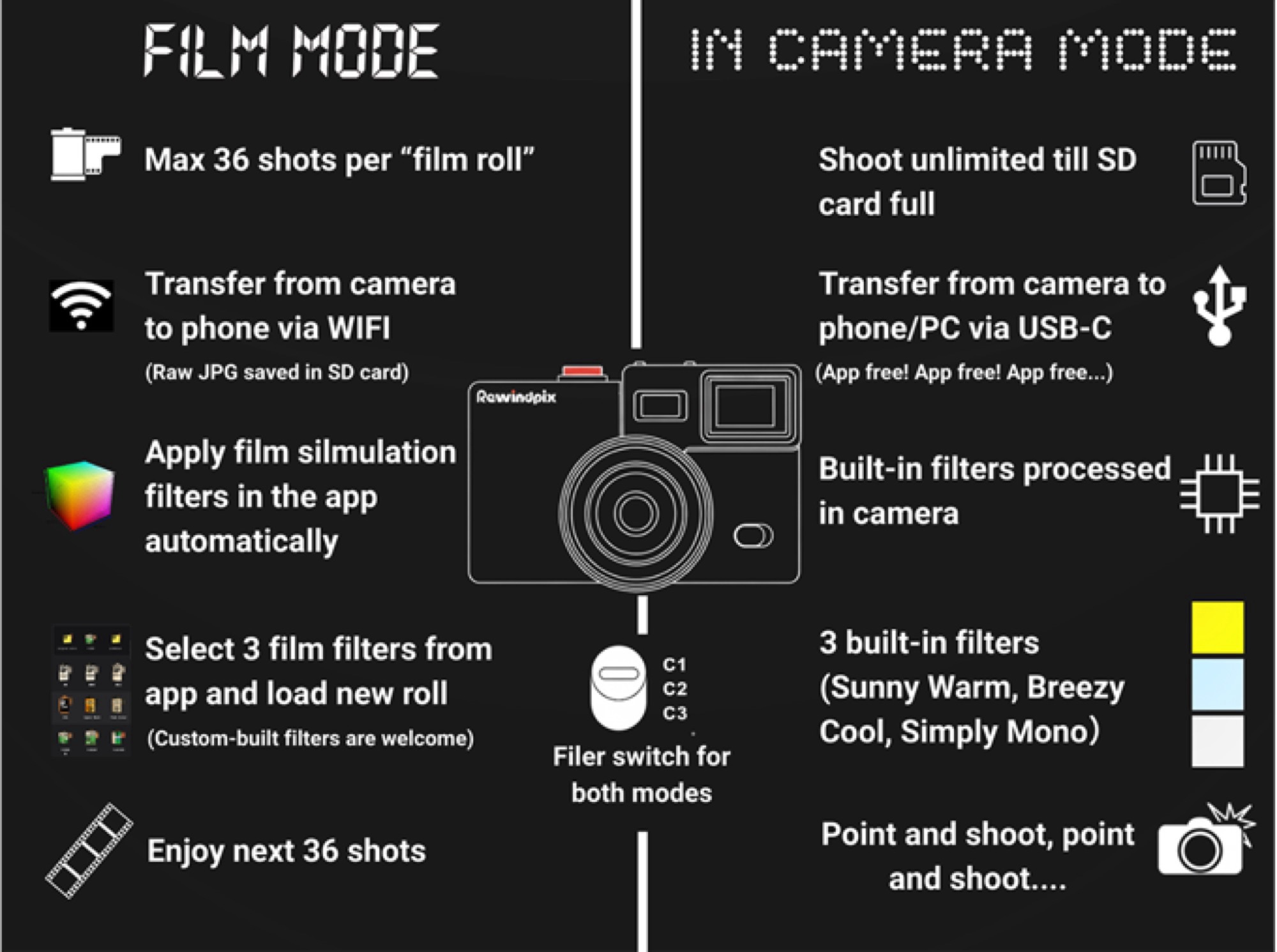 После того, как фотокамера Kodak Charmera имела оглушительный коммерческий успех, компания Rewindpix пытается развить этот успех. При цене $119 камера немного дороже, но и качество снимков должно быть выше, поскольку Rewindpix использует 13-мегапиксельную матрицу формата 1/3,06 дюйма, которая сочетается с 35-мм объективом f/2,2.
