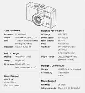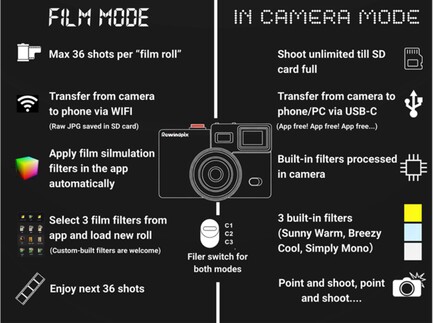 Во-вторых, виртуальные рулоны пленки можно вставить через соответствующее приложение для смартфона, которое разблокирует фильтр и ограниченное количество фотографий. Фотографии можно просматривать только после того, как весь рулон пленки будет передан на смартфон, для чего камера поддерживает Wi-Fi. При желании этот "режим пленки" можно отключить. 1-дюймовый дисплей на задней панели 185-граммовой камеры отображает информацию об аккумуляторе и доступной памяти. В комплект поставки входит карта microSD объемом 4 ГБ.