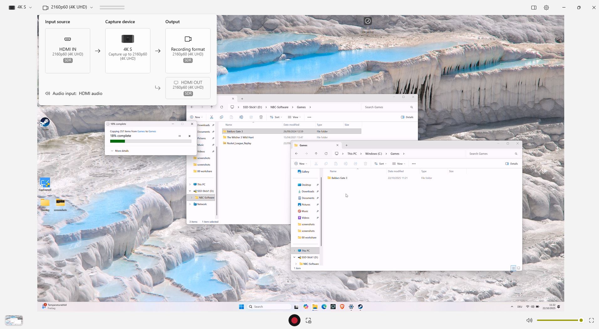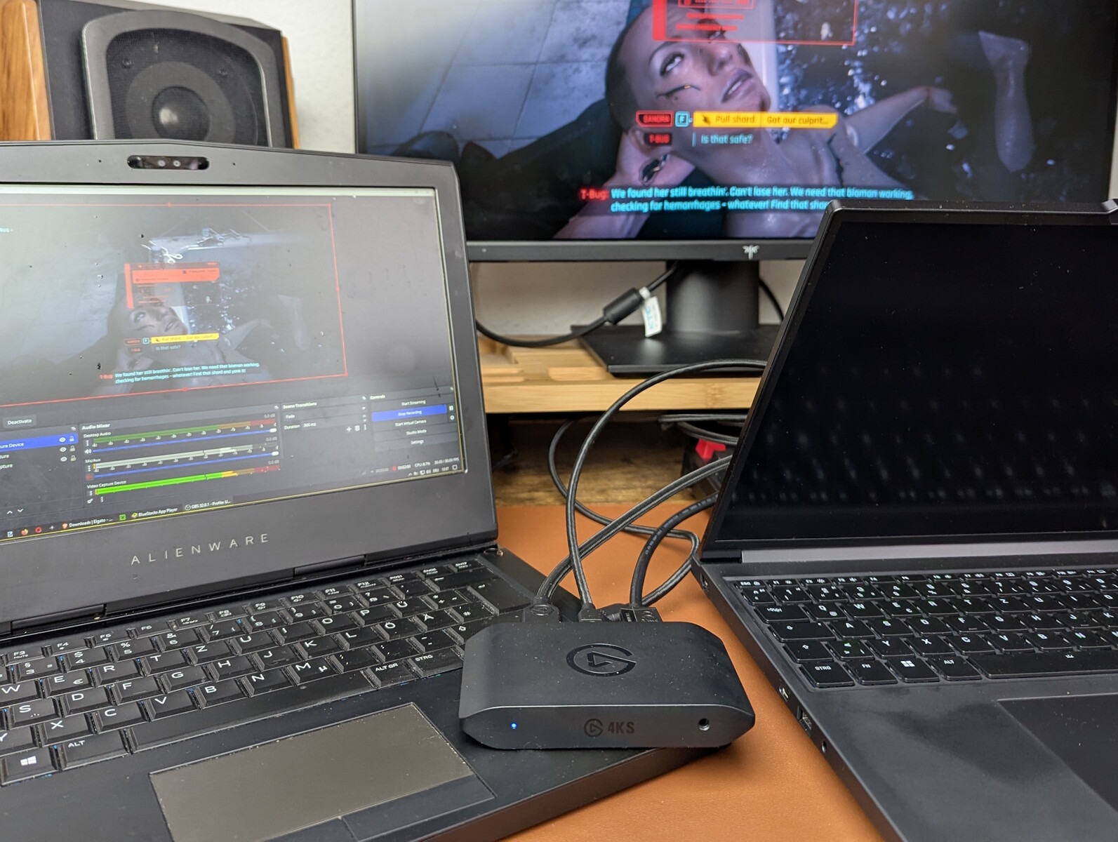 - Съемка компьютерных игр: Мы подключили игровой ноутбук XMG Pro 16 к 4K S и записали игровой процесс из Cyberpunk 2077 в формате 4K. Второй ноутбук был подключен к плате захвата через USB-C и отвечал за запись в приложении Elgato или OBS. Мы также посмотрели на задержку.
