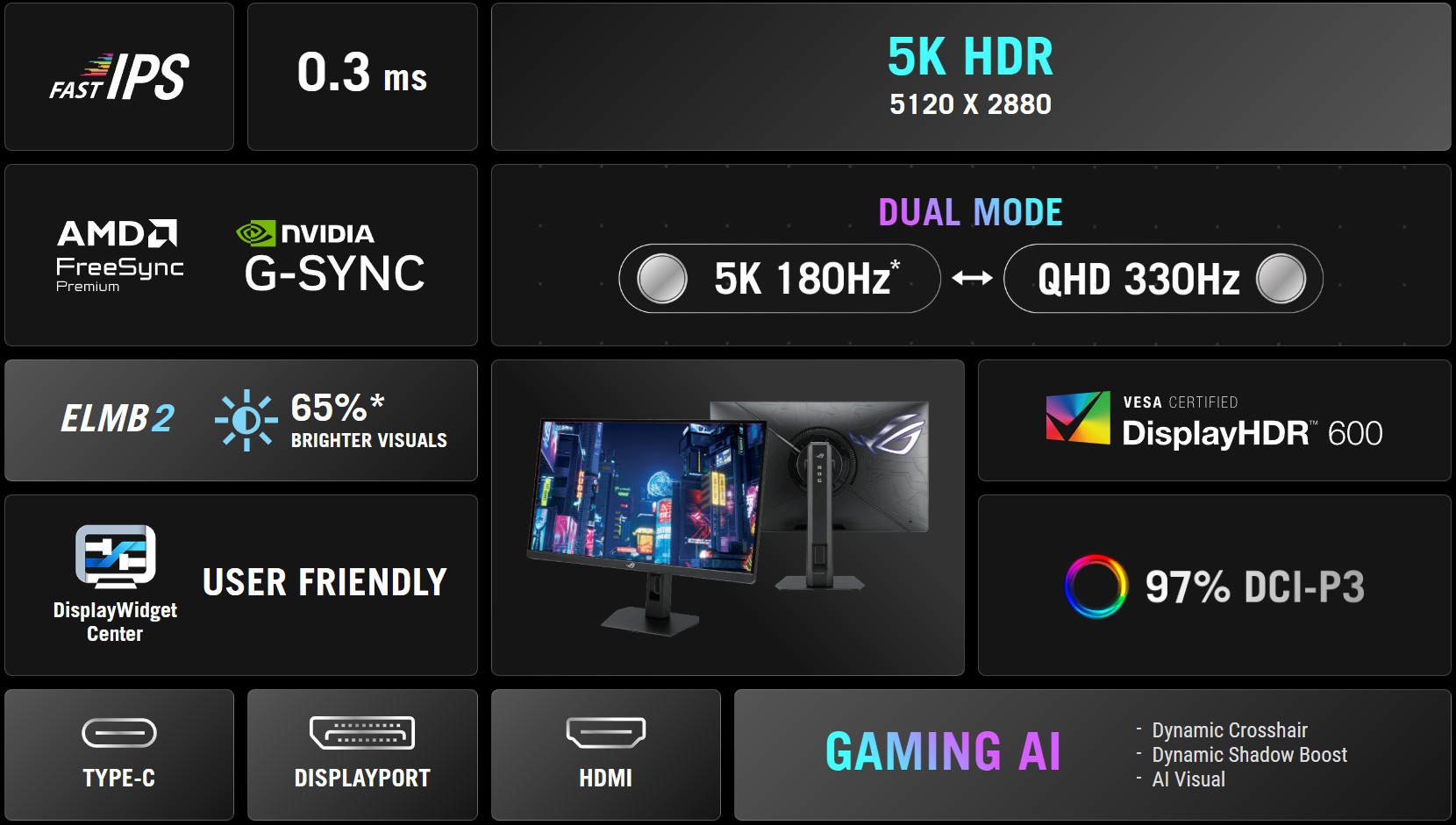 На официальном сайте Asus был замечен новый игровой мониторrOG Strix XG27JCG. Это двухрежимная модель, которая может переключаться между режимами 5K 180 Гц и QHD 180 Гц. Конечно, прежняя частота обновления при разрешении 5120x2880 пикселей действует только в разогнанном режиме, но это все равно впечатляющее число.