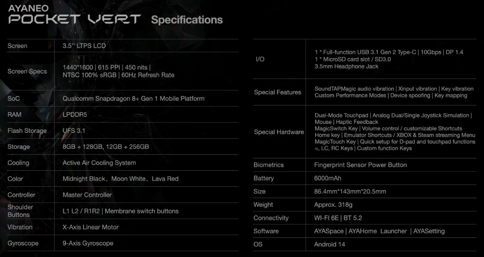 Как сообщалось ранее, Pocket Vert будет оснащен 3,5-дюймовой LTPS LCD панелью с разрешением 1440 x 1600 (615 PPI), частотой обновления 60 Гц и яркостью 450 нит. Теперь компания Ayaneo сообщила, что Pocket Vert будет оснащен процессором Мобильная платформа Snapdragon 8+ Gen 1. Этот процессор был выпущен в мае 2022 года и использовался в таких телефонах, как Samsung Galaxy Z Fold 4 и OnePlus 10T.