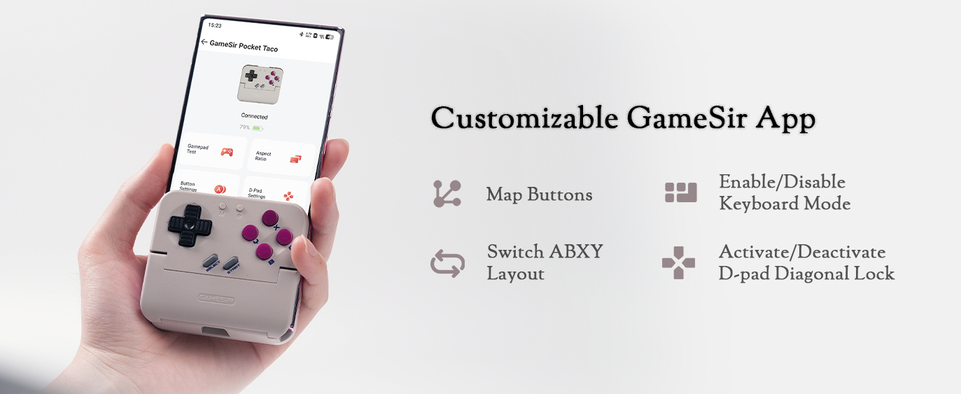 Контроллер работает с приложением GameSir, которое предоставляет пользователям ряд возможностей по настройке, таких как регулировка соотношения сторон/масштабирование дисплея, изменение расположения кнопок (Switch или Xbox), замена клавиш L1 и L2 или R1 и R2, включение диагональной блокировки D-pad и активация режима клавиатуры.
