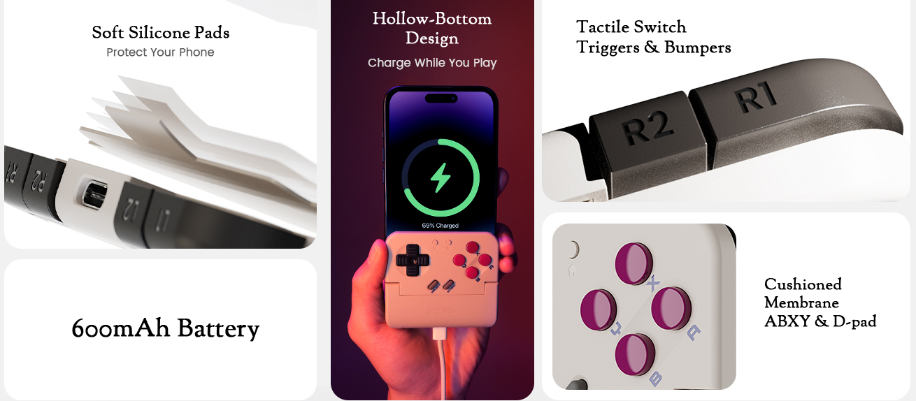 GameSir Pocket Taco весит 62,2 грамма и оснащен встроенным аккумулятором емкостью 600 мАч, которого хватит на несколько часов игры. Контроллер также имеет углубление в нижней части, которое совпадает с портом Вашего телефона, позволяя Вам вставить кабель для зарядки, так что Вы сможете заряжаться во время игры.