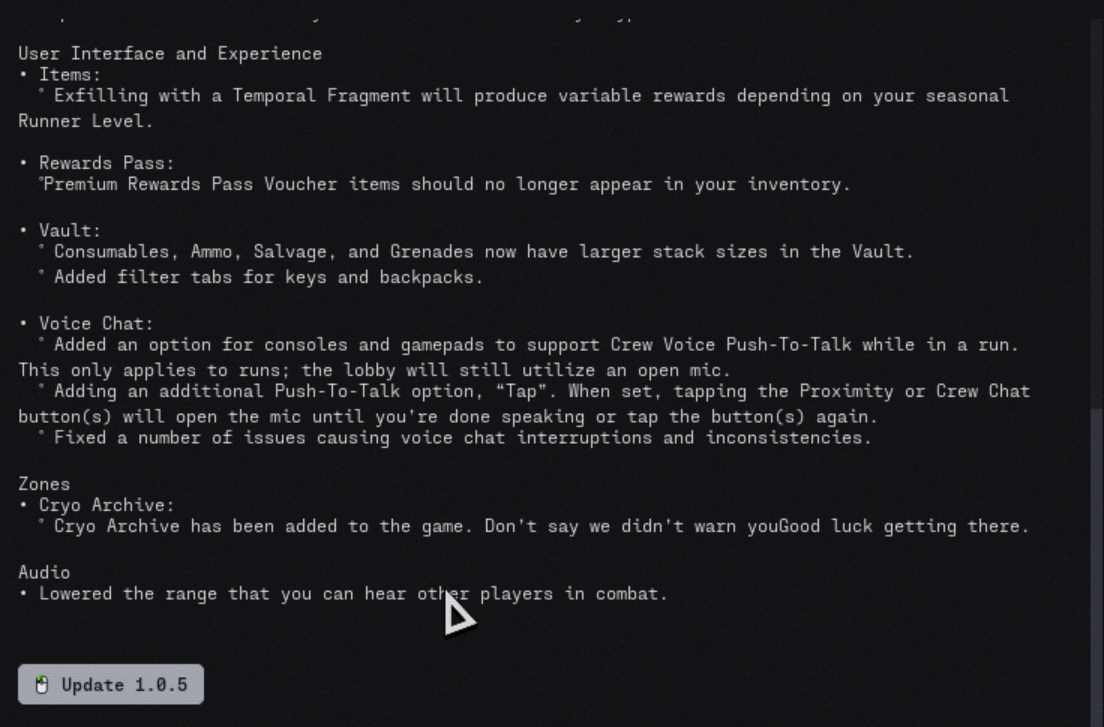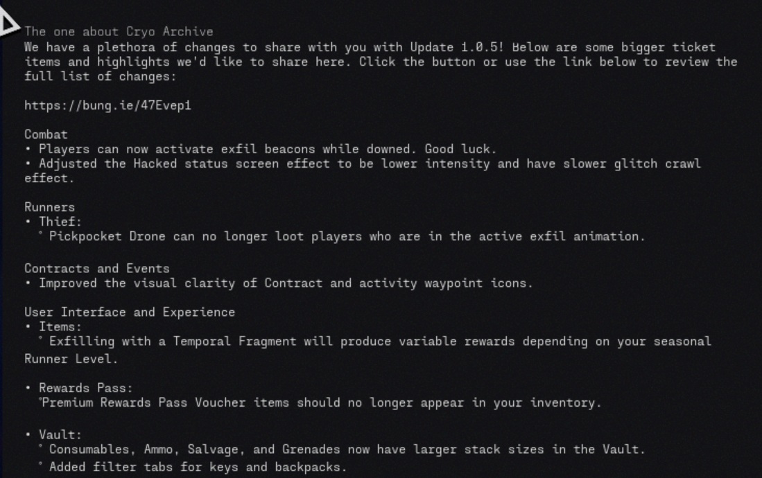 Обновление Marathon 1.0.5 добавляет новую зону Cryo Archive, позволяет игрокам активировать маяки exfil во время падения, а также вносит длинный список изменений в бой, контракты, пользовательский интерфейс, голосовой чат, стабильность, оружие, моды и аудио. Bungie также привязала несколько новых дополнений к луту непосредственно в Cryo Archive, включая перки и моды для имплантов, которые можно найти только там.