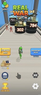 В Real War есть два режима игры - бесконечный режим, в котором отслеживается Ваш высокий результат (мой - 378), и режим приключений, в котором Вы проходите уровни и зарабатываете монеты. Монеты можно использовать для удаления рекламы - на это может уйти некоторое время, поскольку прохождение уровня приносит 10 монет, а удаление рекламы стоит 10 000. Есть и другие способы заработать монеты, например, присоединиться к Discord разработчика через опцию на экране меню игры, за что дается 200 монет, или смотреть рекламу за 100 монет.